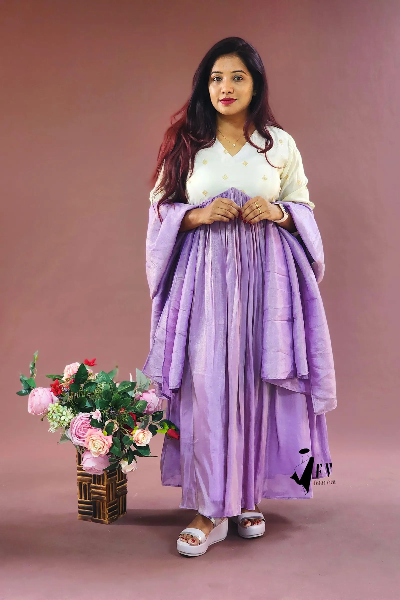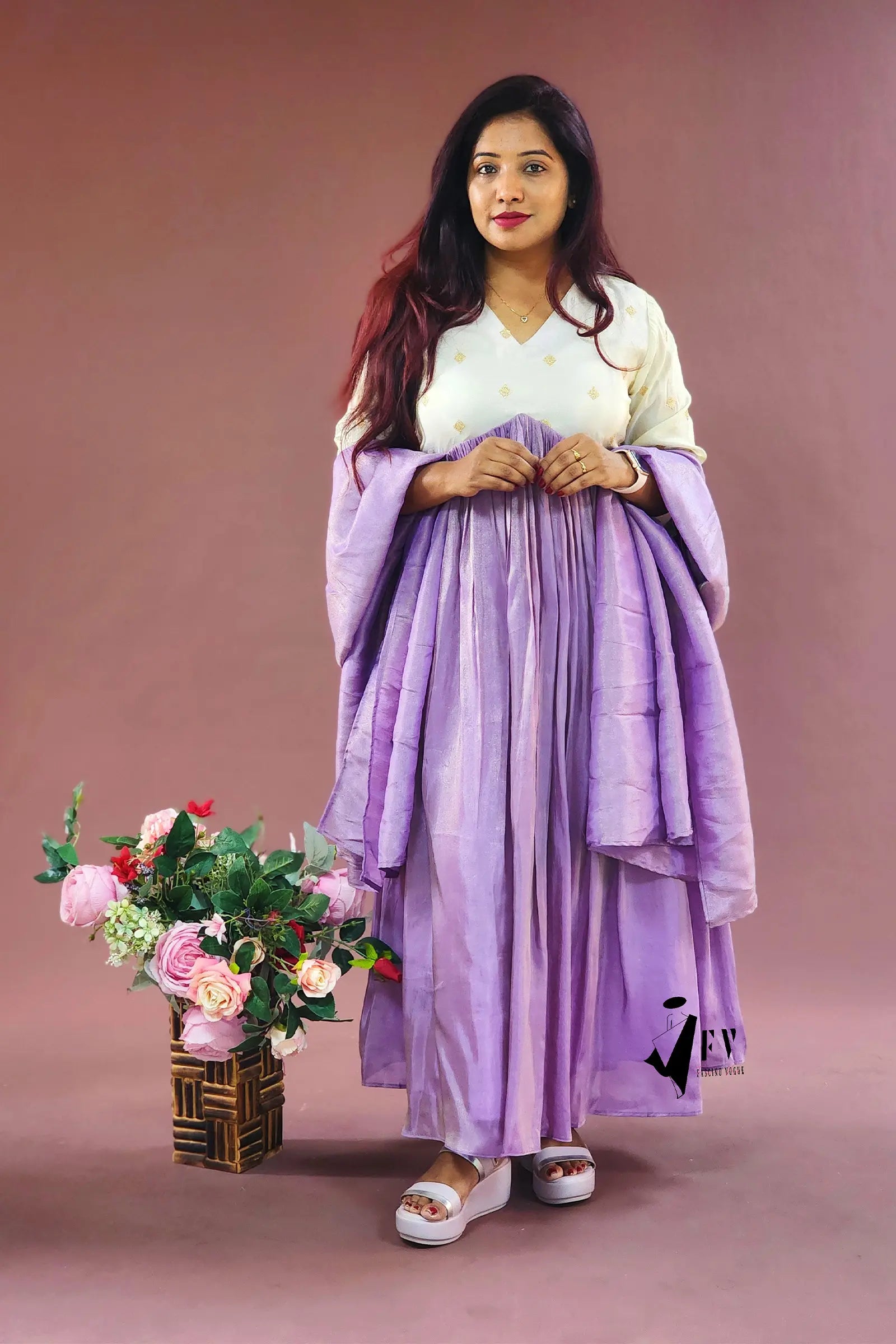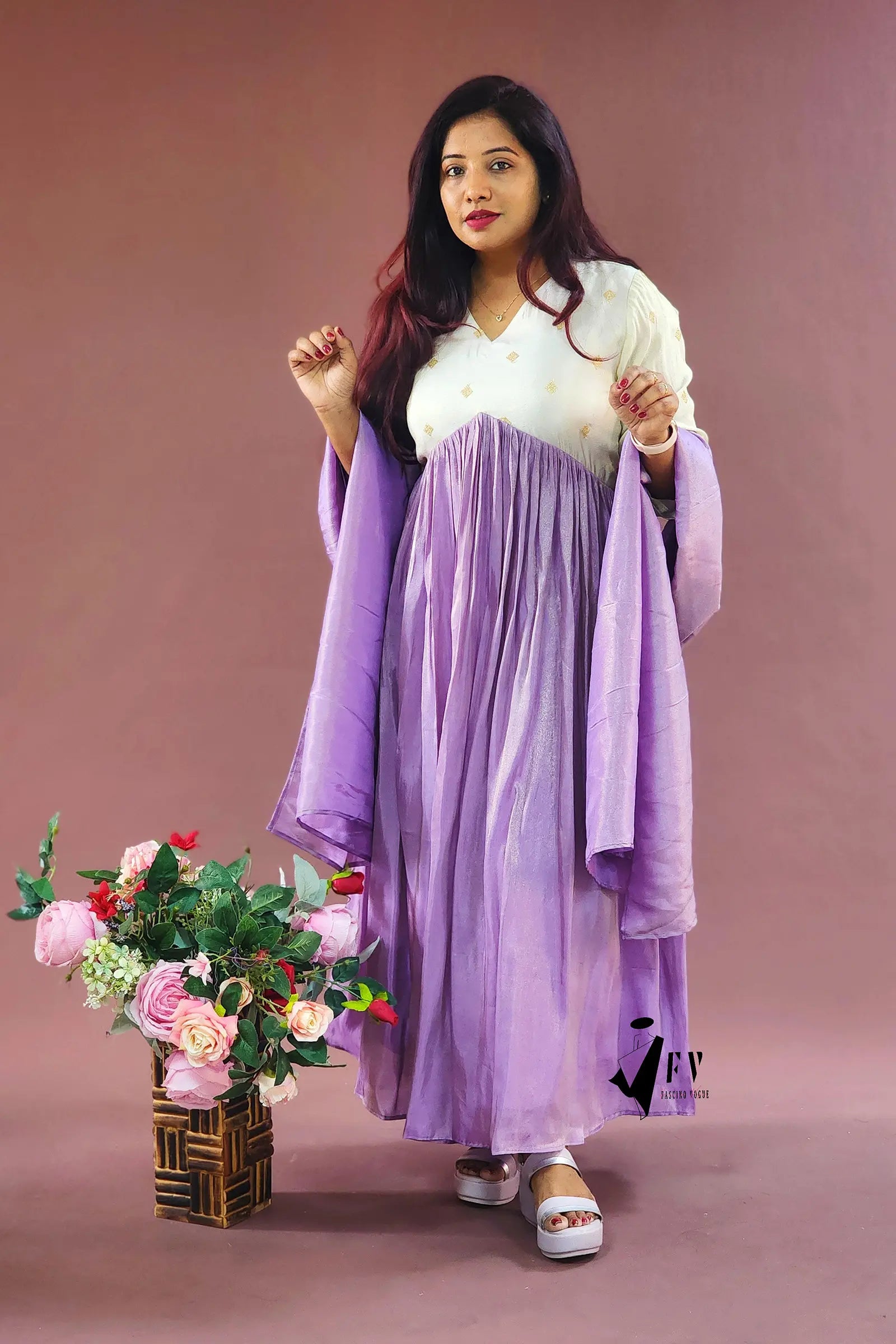Exude grace and charm with this elegant ivory lavender Alia cut Anarkali set, featuring chic 3/4 sleeves. Perfect for any occasion, the Anarkali is crafted with a silk base and stitched with a lining inside for comfort and durability. It is paired with a luxurious lavender silk dupatta that adds a touch of sophistication to the ensemble.