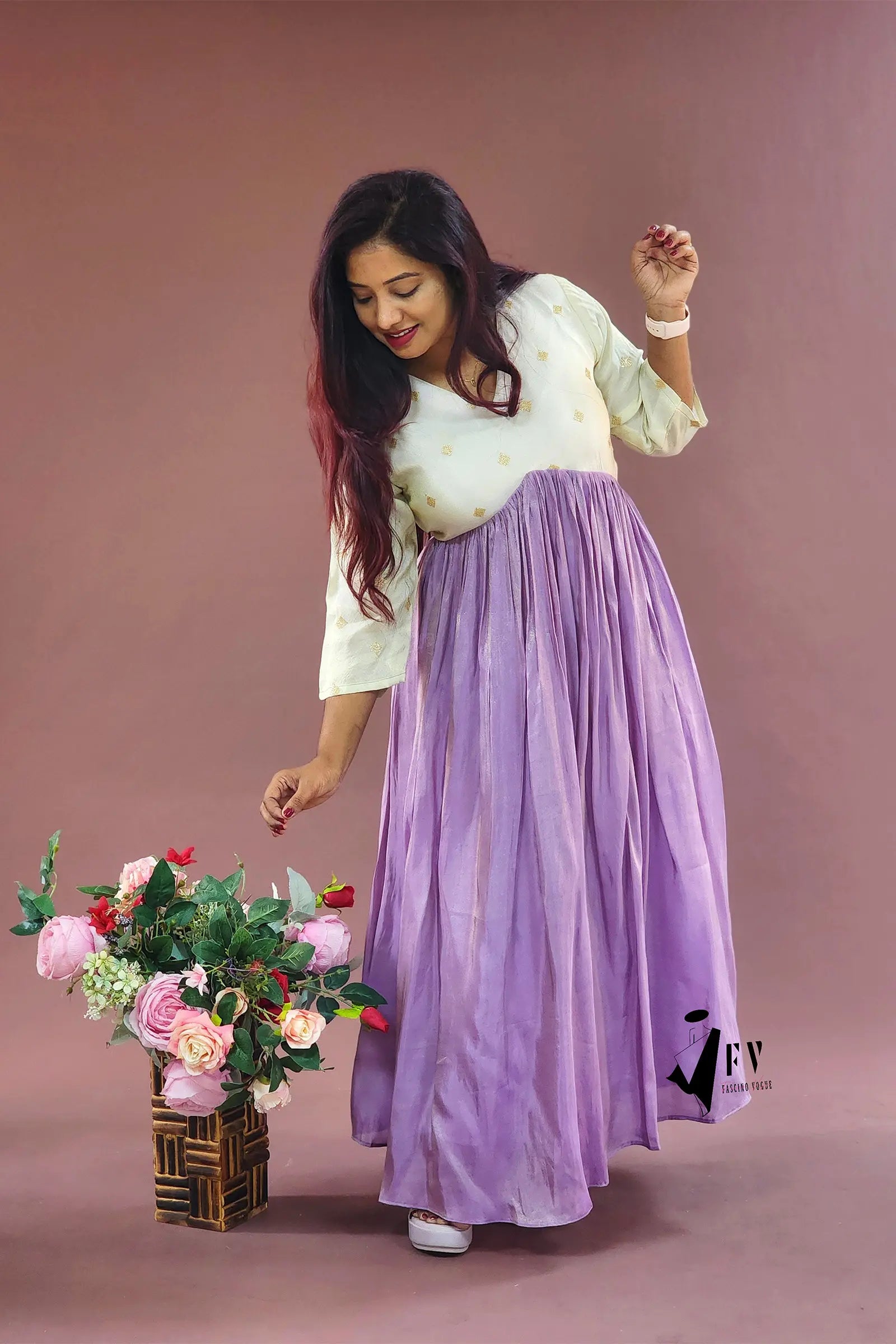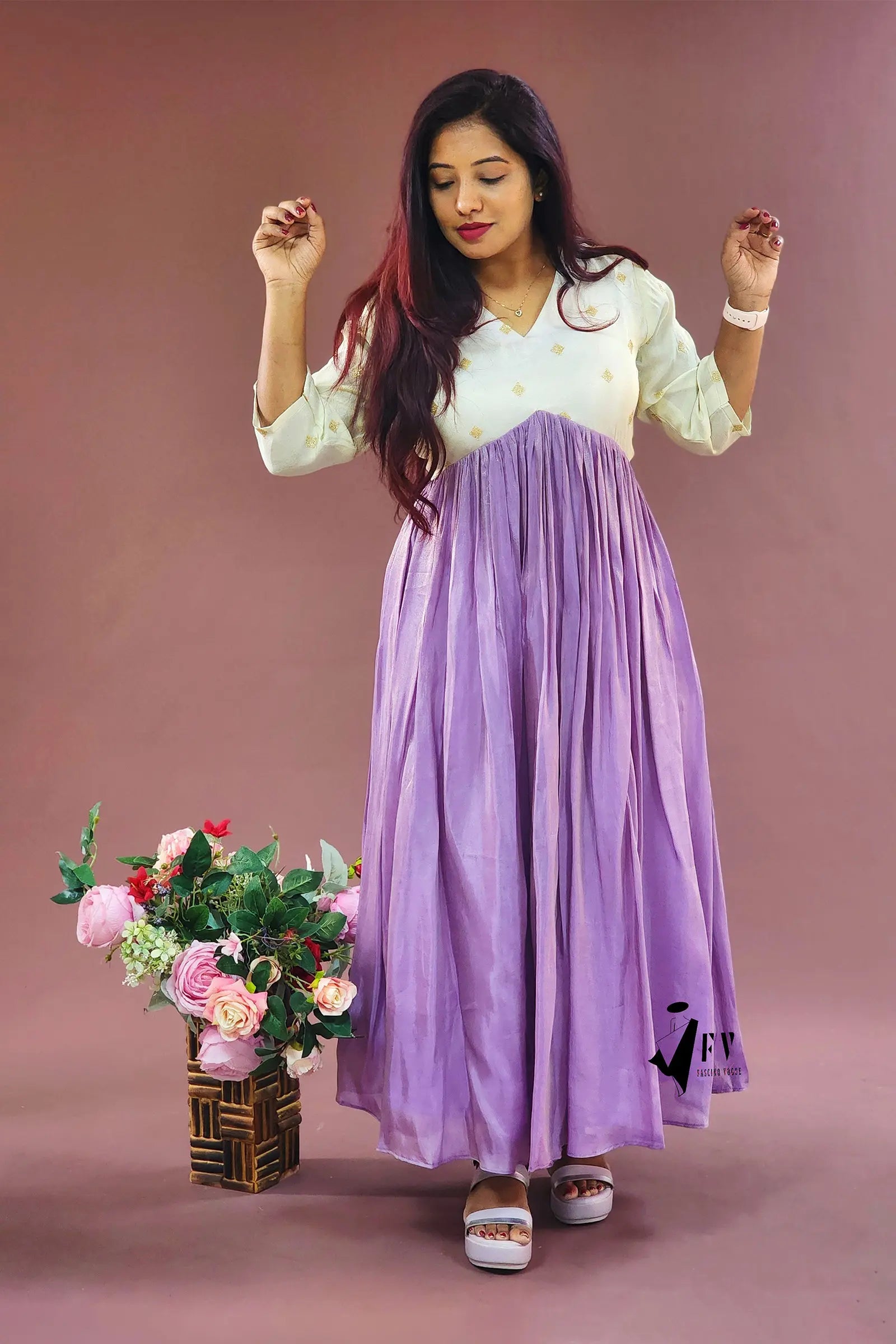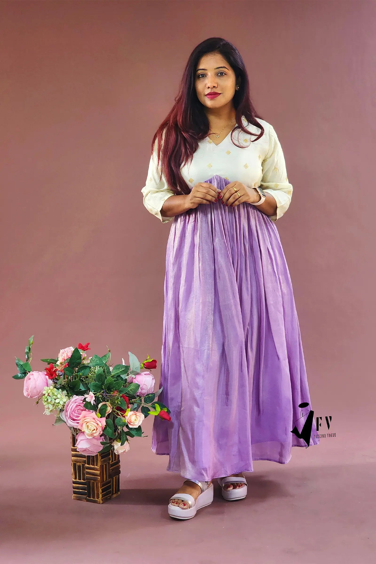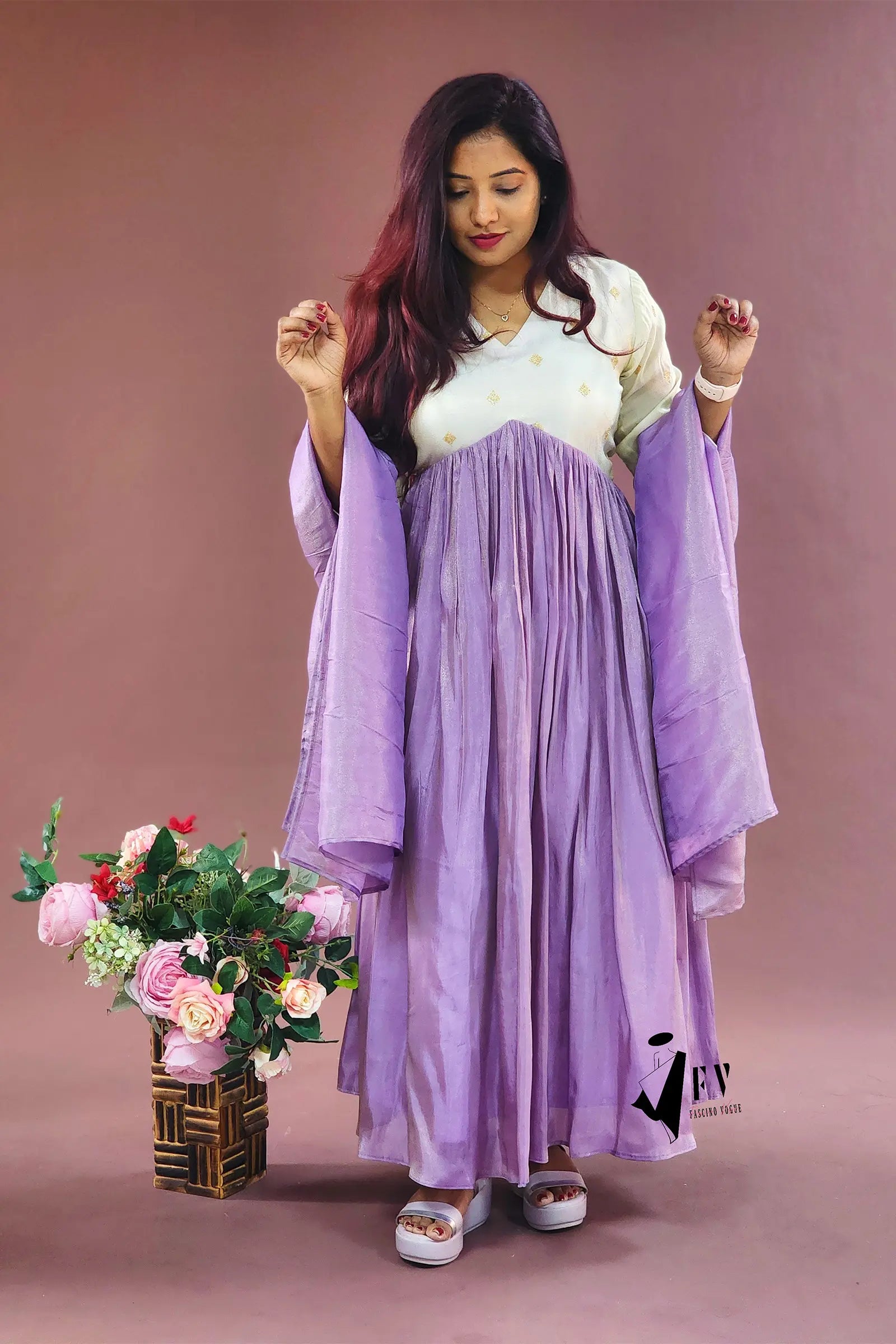 Exude grace and charm with this elegant ivory lavender Alia cut Anarkali set, featuring chic 3/4 sleeves. Perfect for any occasion, the Anarkali is crafted with a silk base and stitched with a lining inside for comfort and durability. It is paired with a luxurious lavender silk dupatta that adds a touch of sophistication to the ensemble.