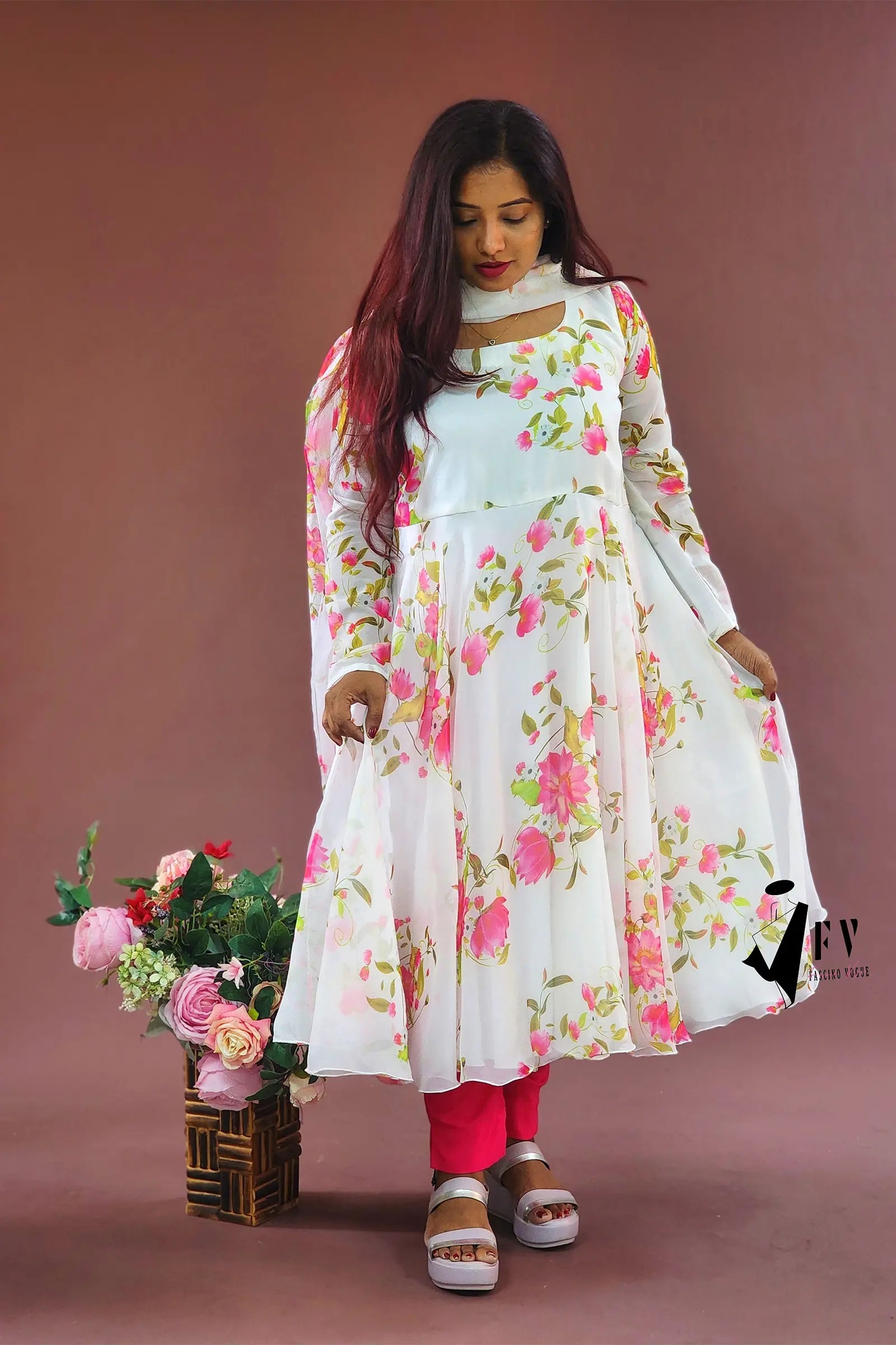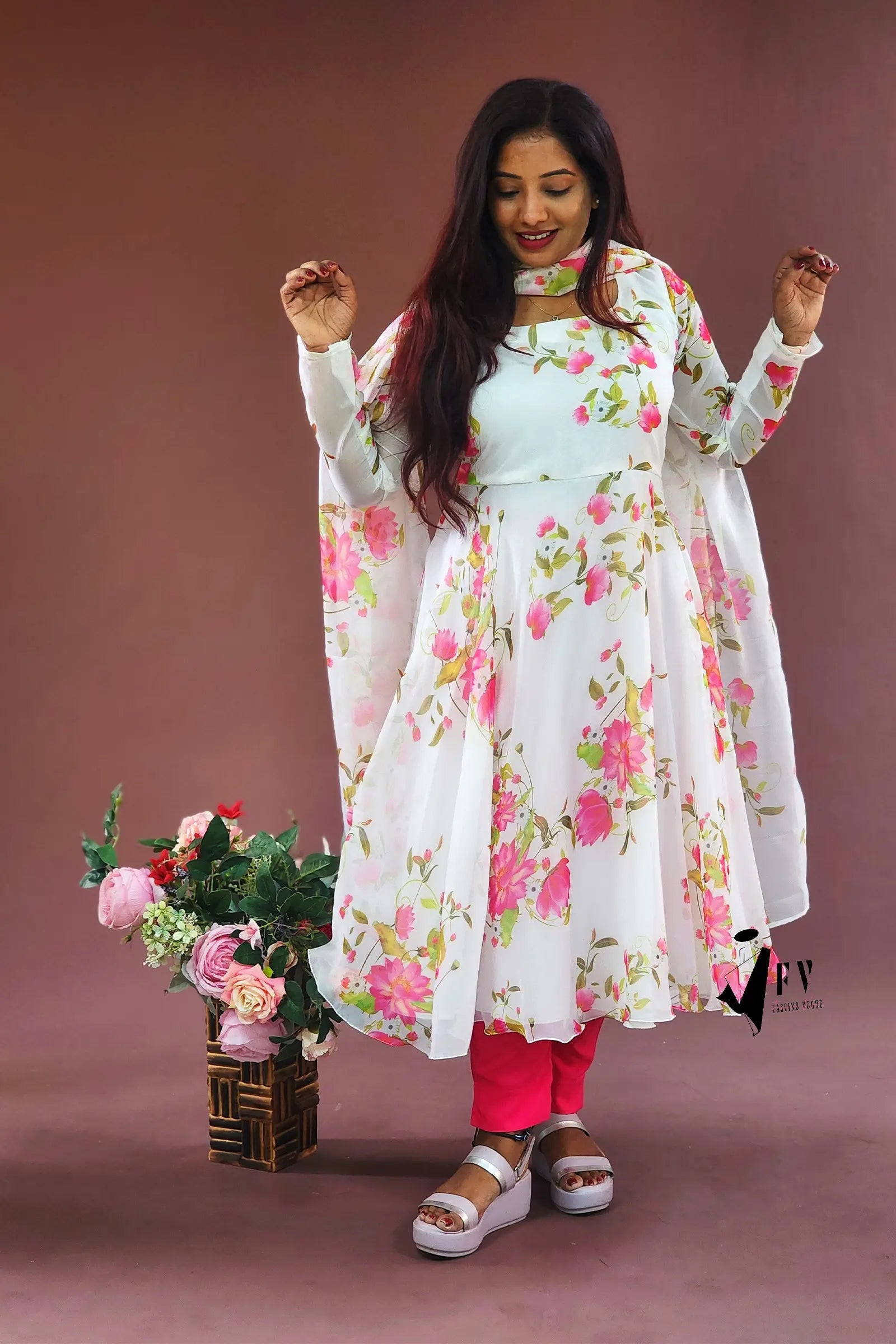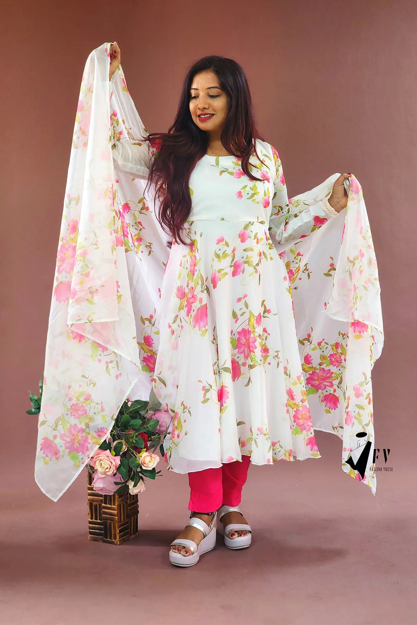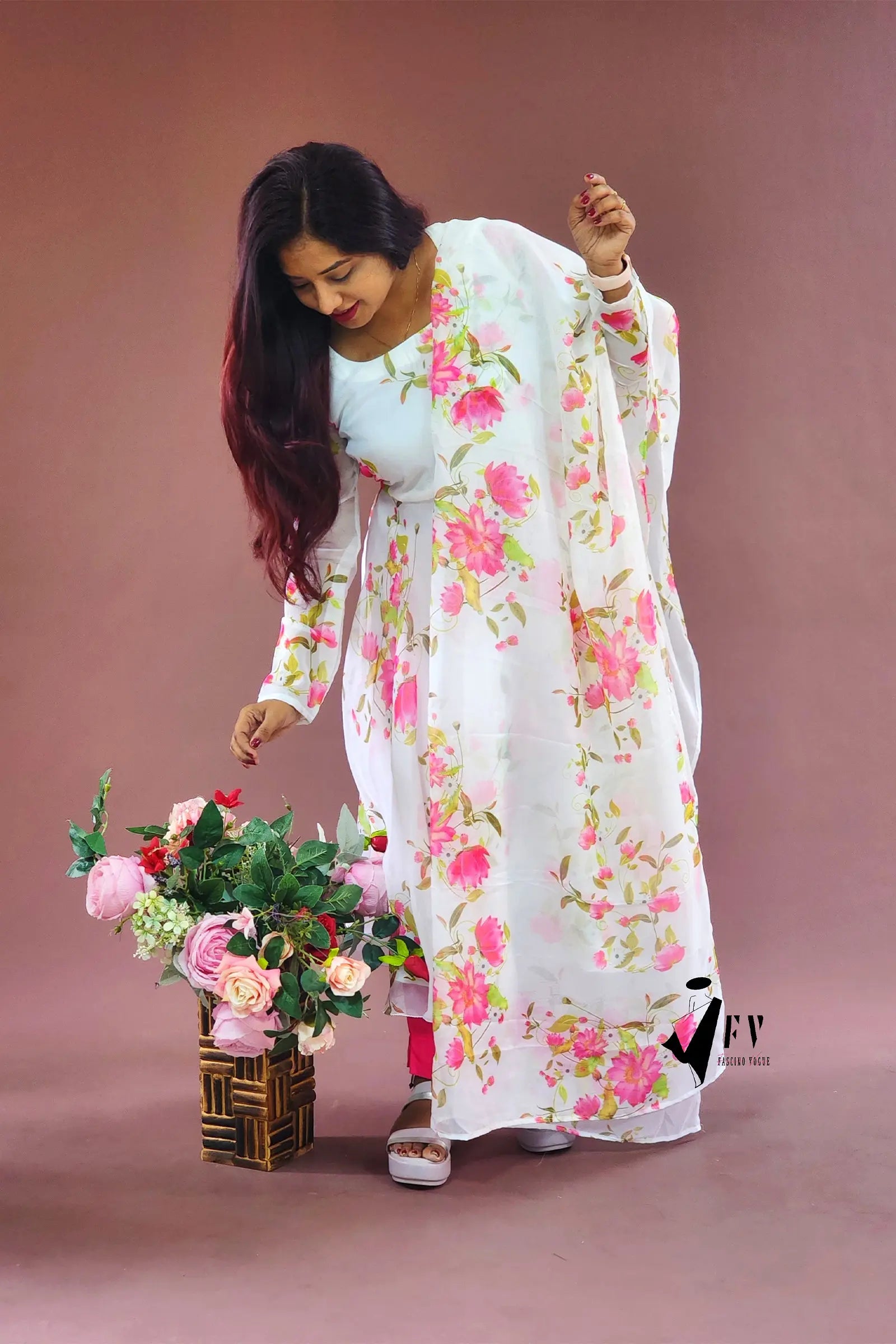This classy white and pink floral Anarkali set, with full sleeves, is perfect for any occasion. Crafted from soft organza fabric, the Anarkali is stitched with a lining inside for added comfort. It is paired with matching pink pants and a self-colored dupatta, making it a complete ensemble for a stylish and elegant look.