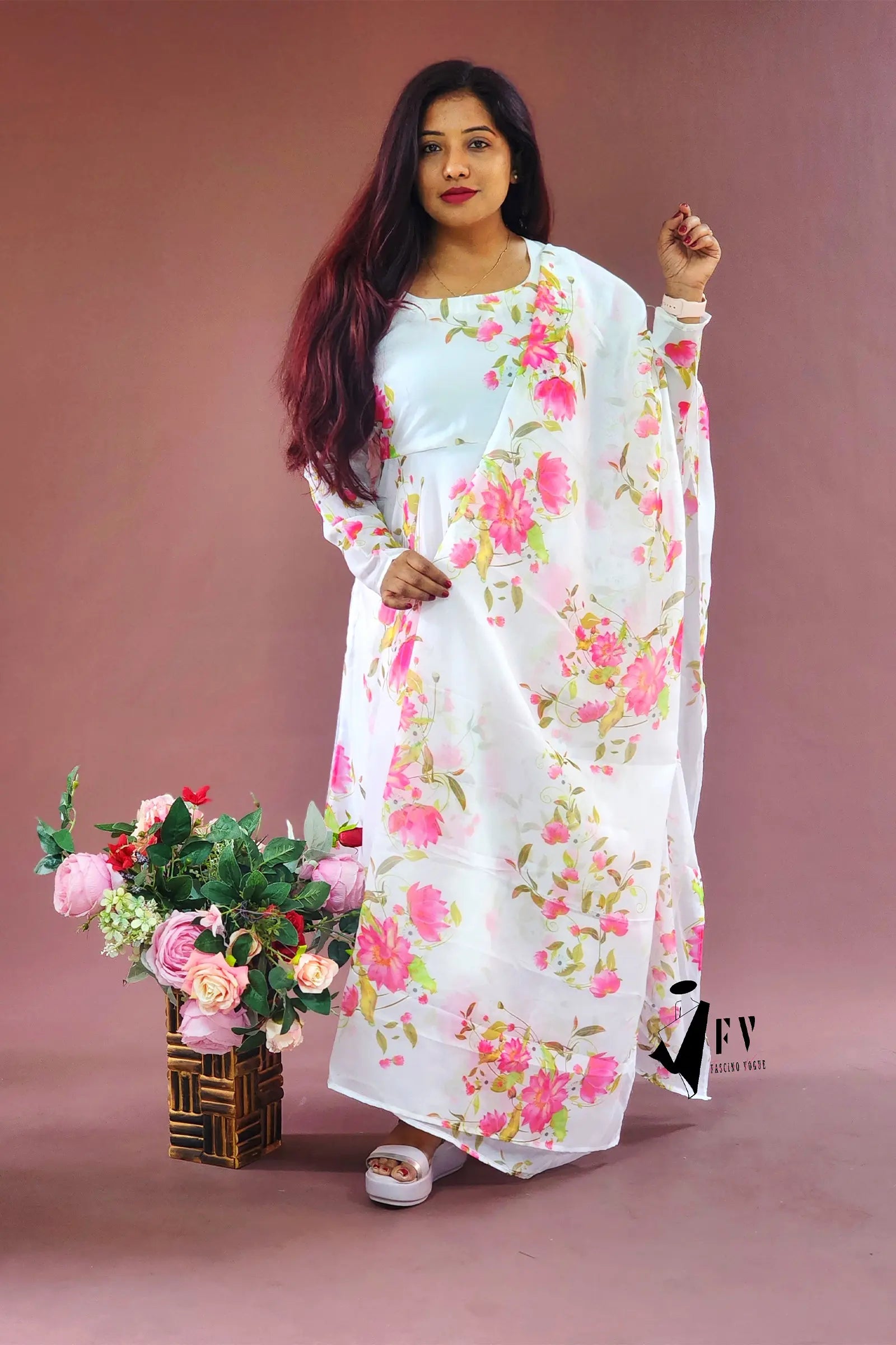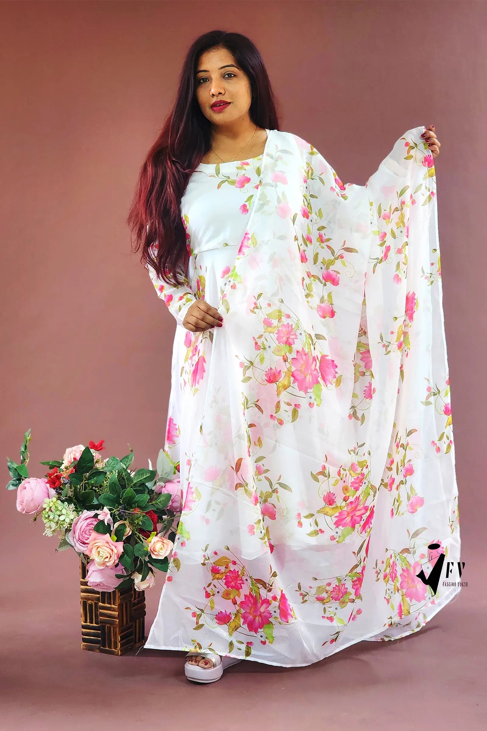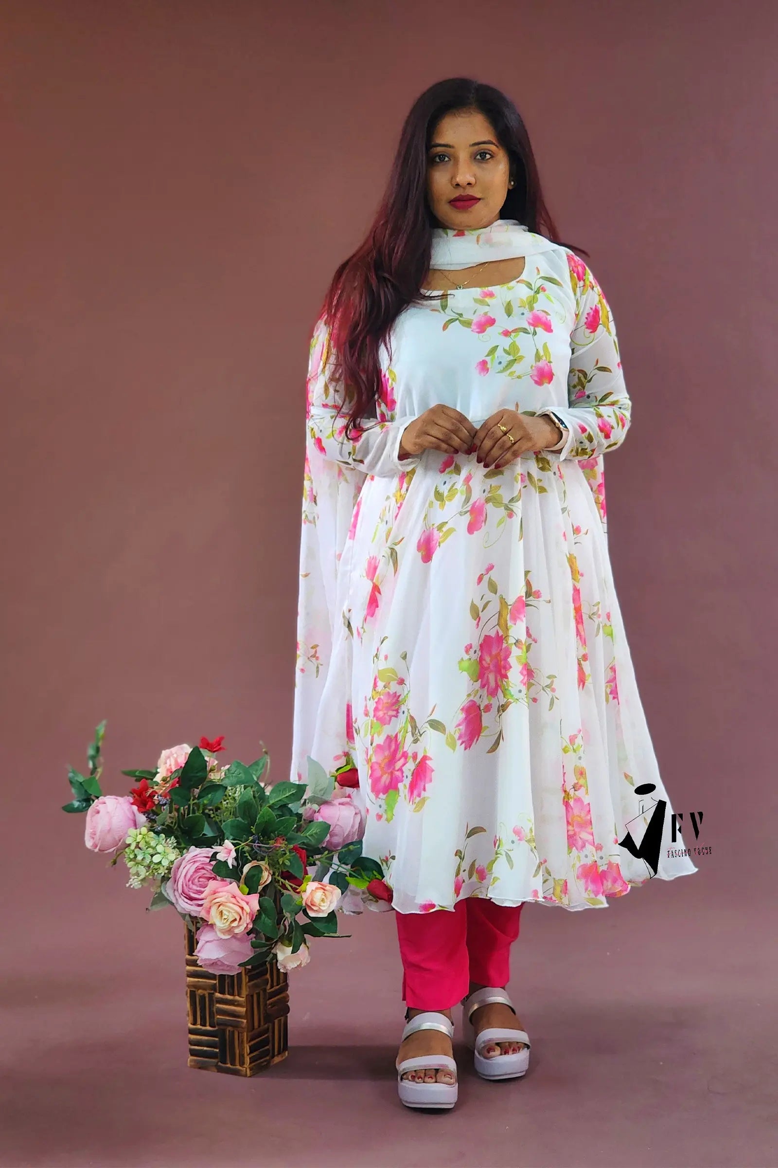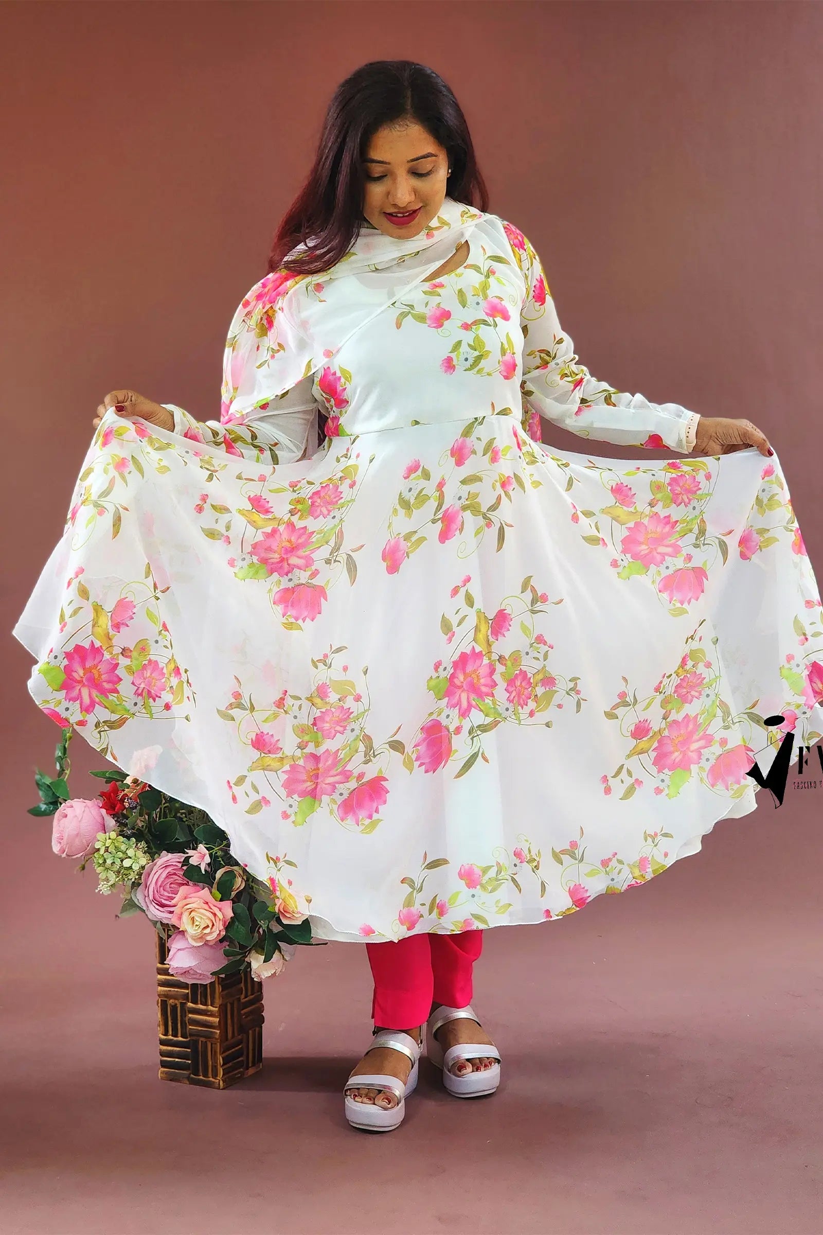 This classy white and pink floral Anarkali set, with full sleeves, is perfect for any occasion. Crafted from soft organza fabric, the Anarkali is stitched with a lining inside for added comfort. It is paired with matching pink pants and a self-colored dupatta, making it a complete ensemble for a stylish and elegant look.