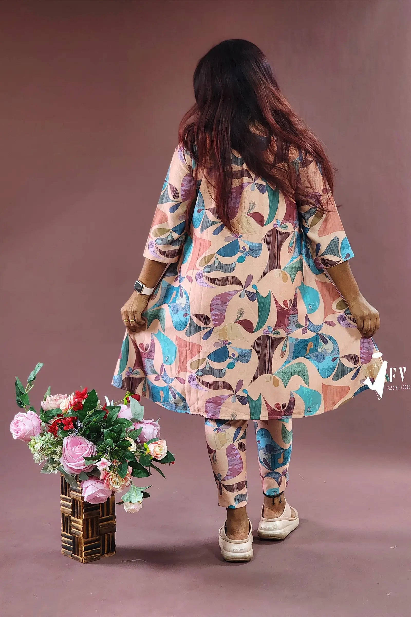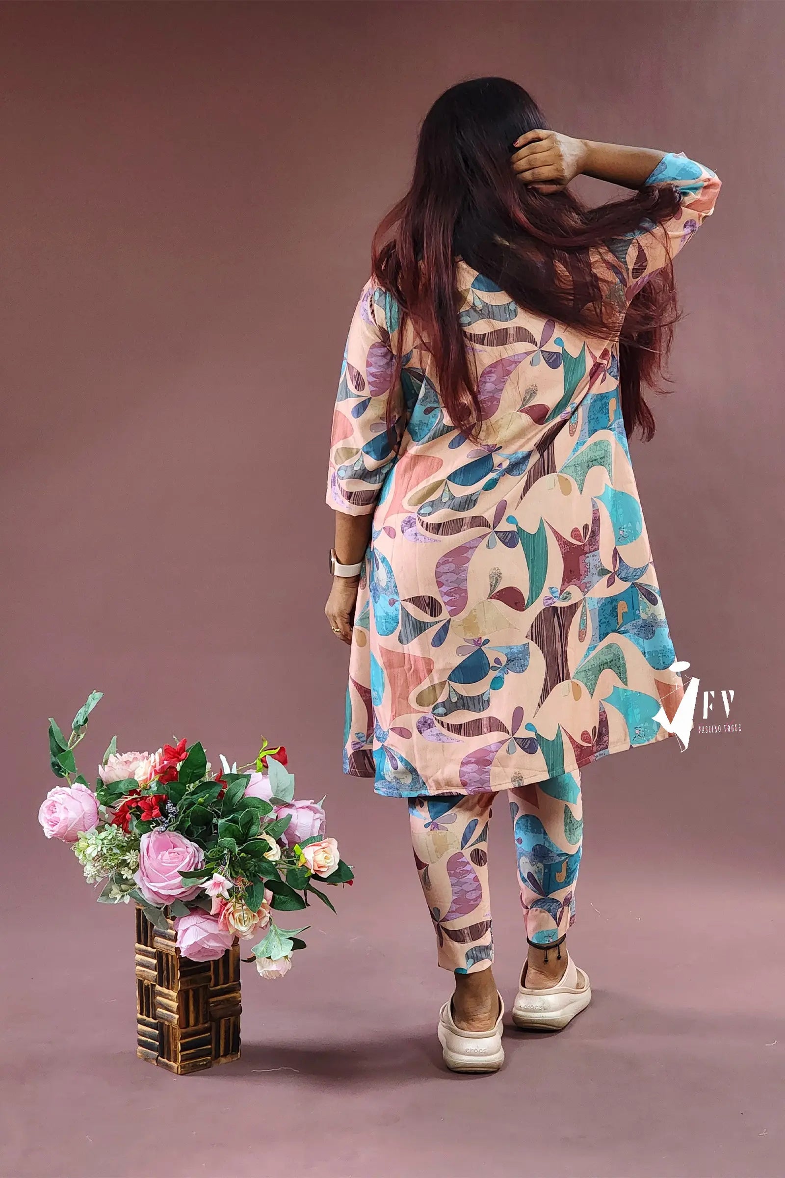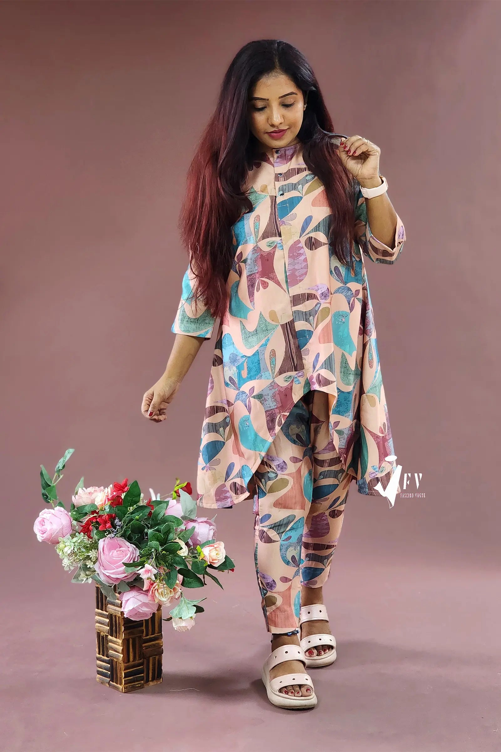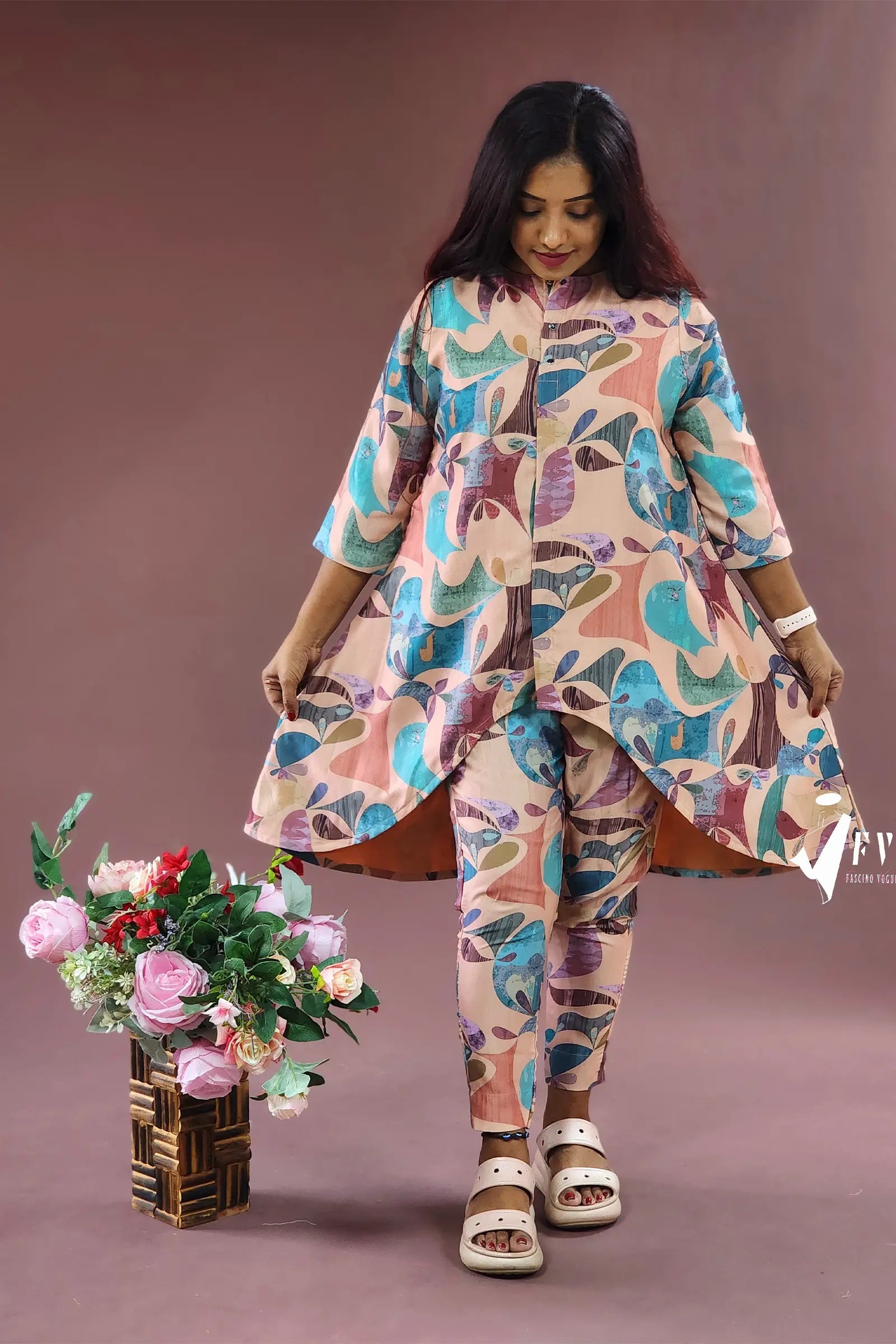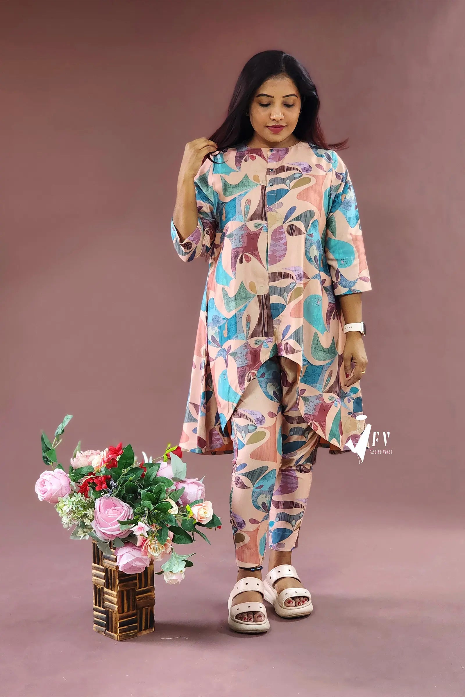 This cotton high-low two-piece co-ord set, featuring 3/4th sleeves, is the perfect outfit for a day out or any casual occasion. Made from a silk base cotton fabric, the top is stitched with a lining inside for extra comfort. The pastel prints add a refreshing and stylish touch to the ensemble.