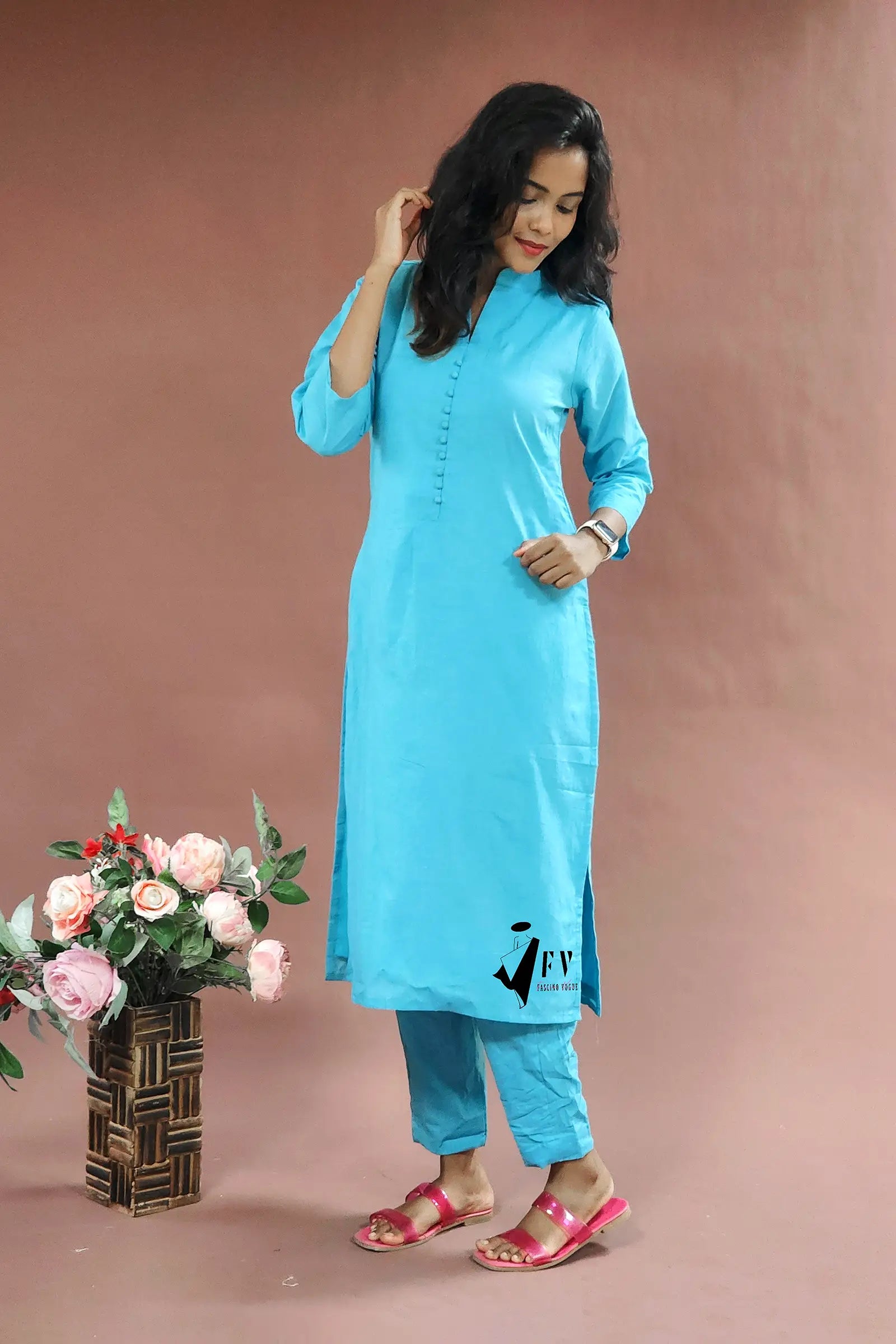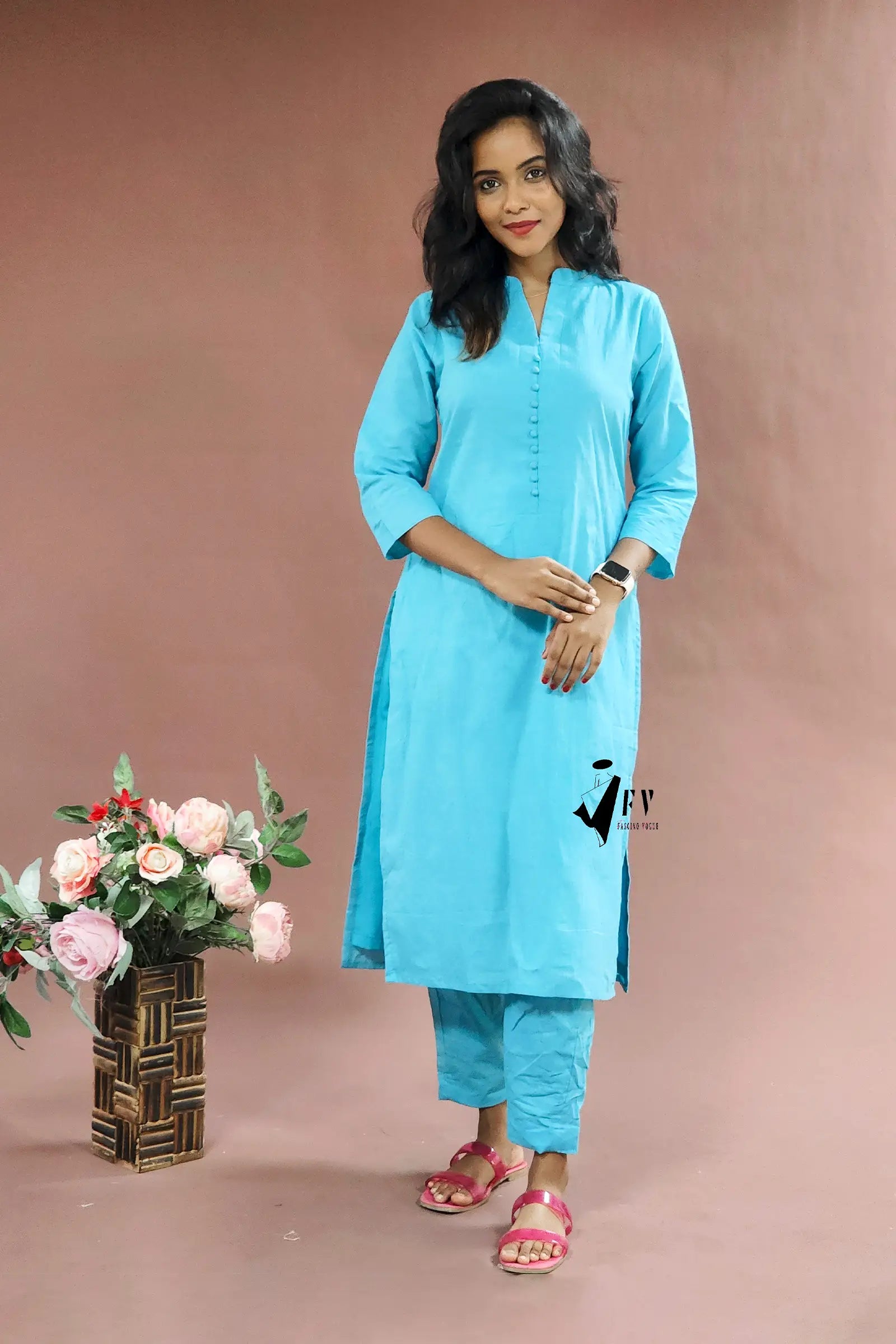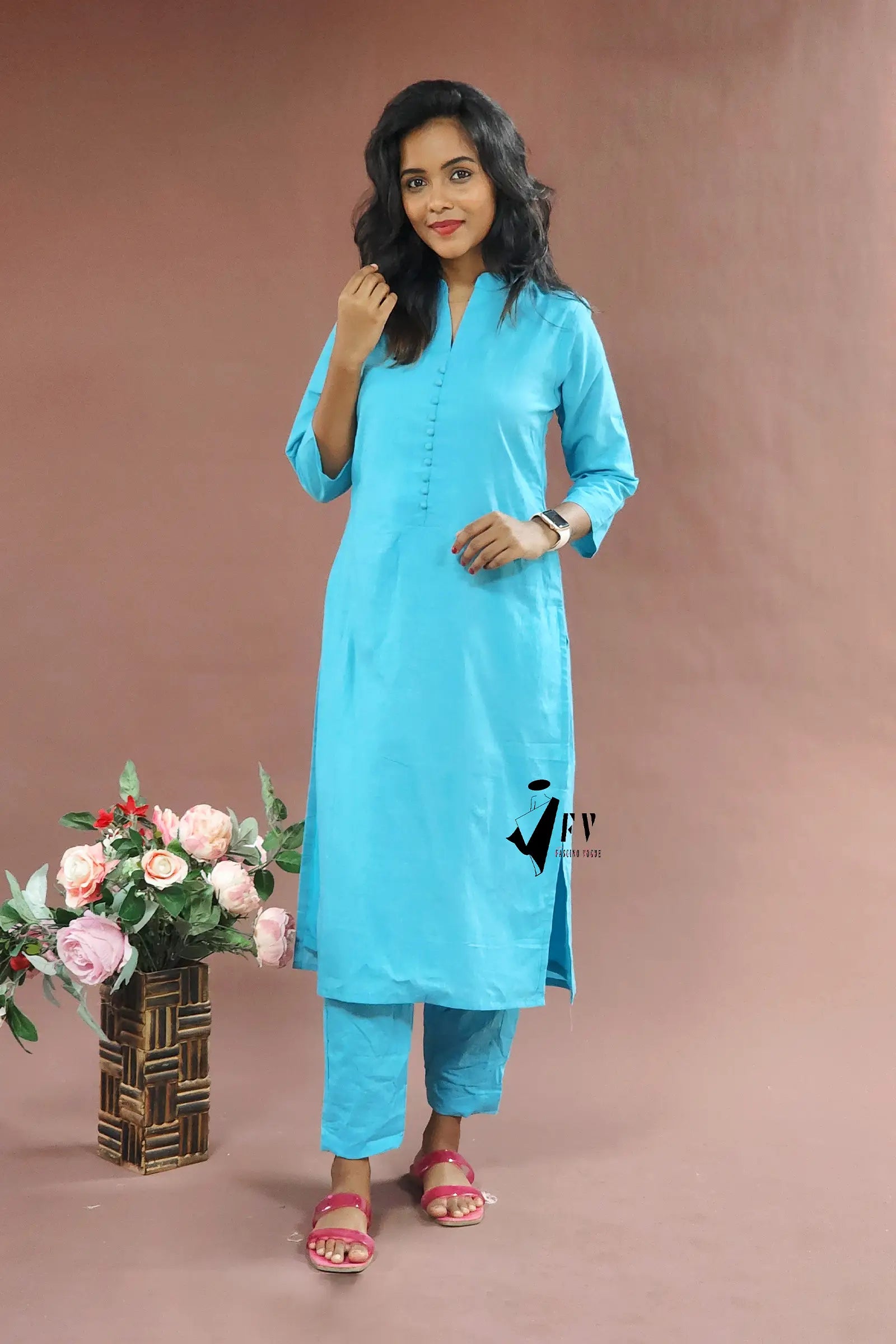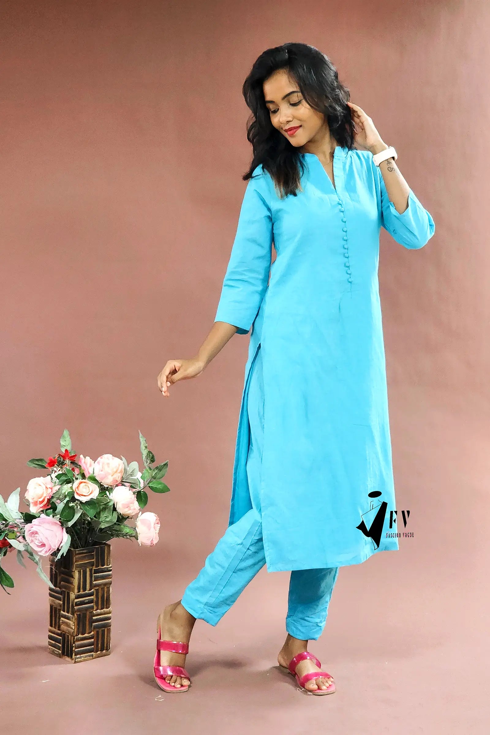 Embrace effortless style with this gorgeous blue cotton salwar featuring 3/4 sleeves, perfect for any casual day. The top is crafted from premium Kora Cotton and comes complete with a matching pant for a coordinated look.