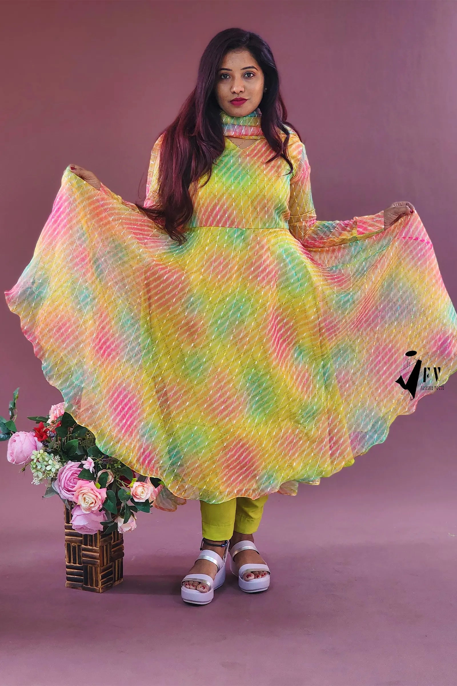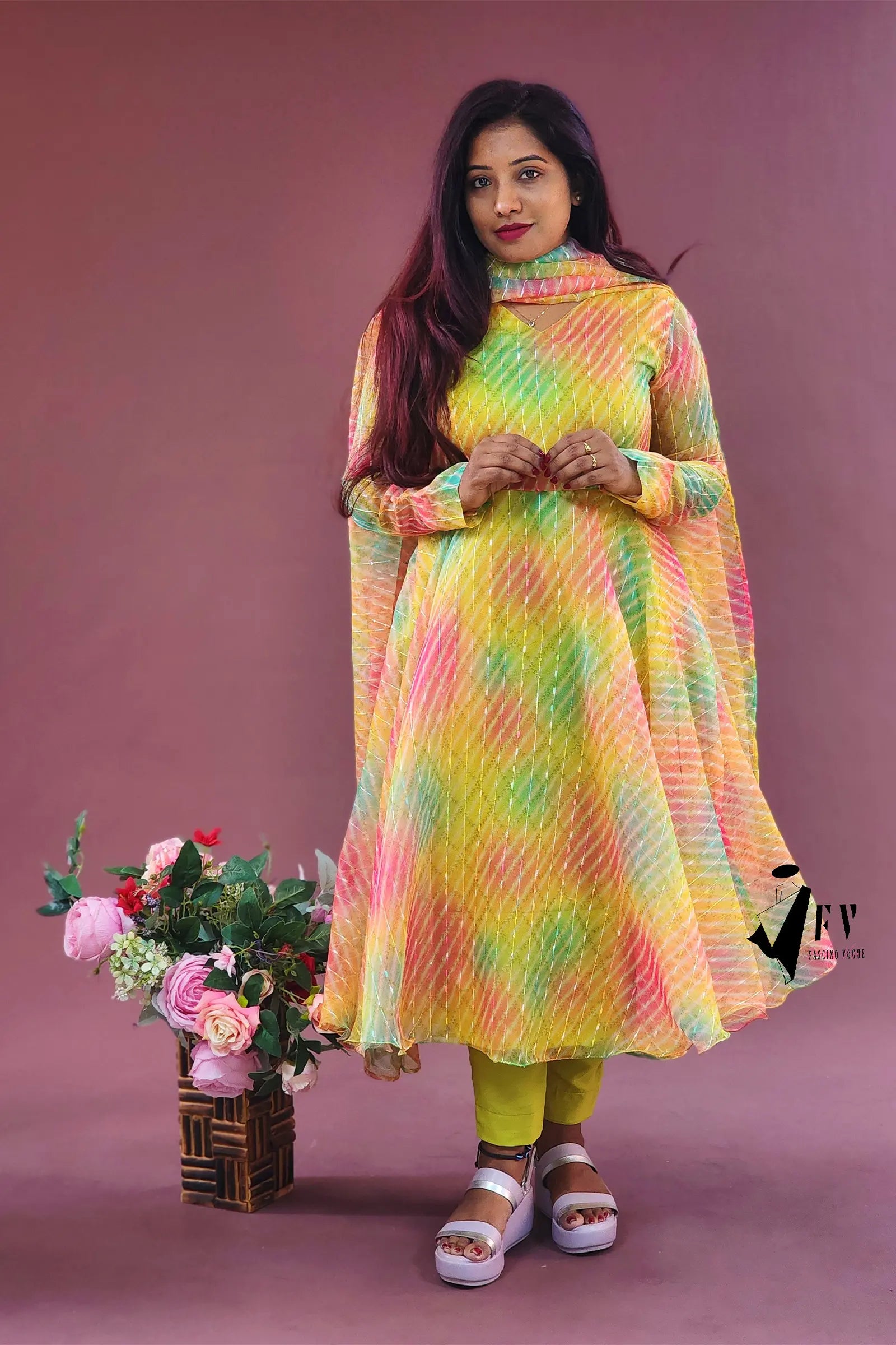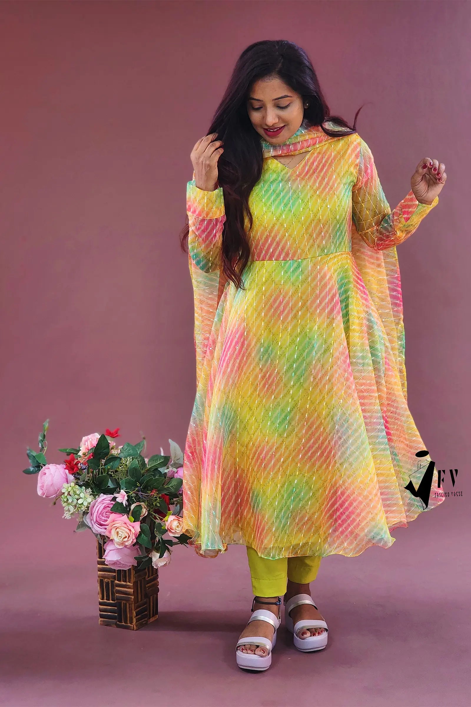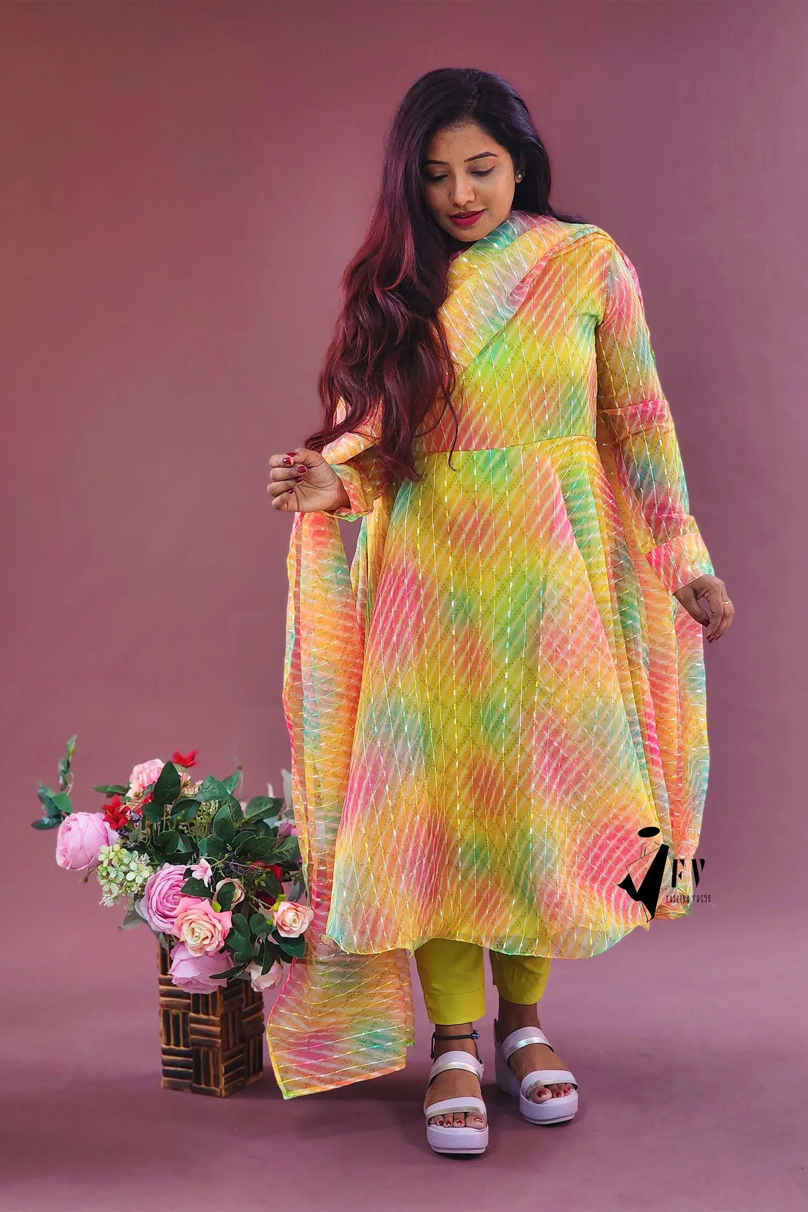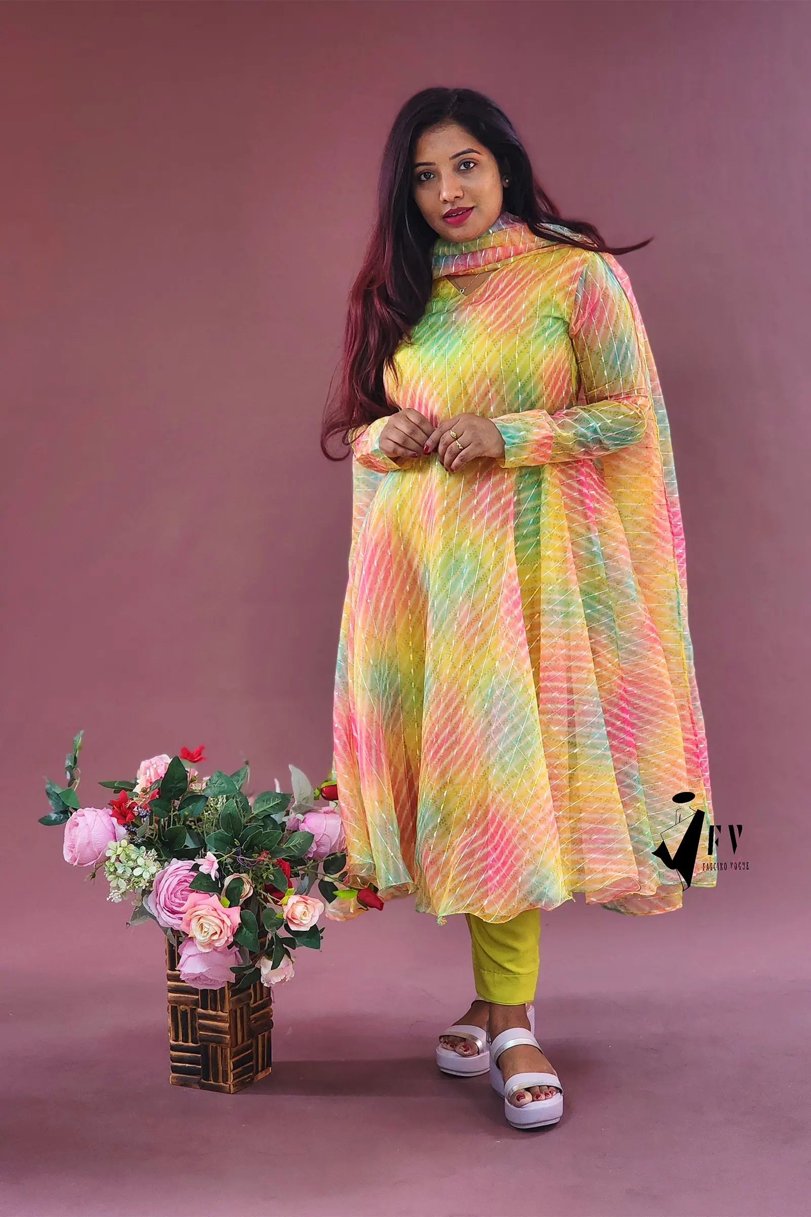 Step into timeless elegance with this beautiful multi-color Anarkali set, featuring full sleeves and a flowy silhouette perfect for any occasion. Crafted from luxurious organza fabric, this set comes with a coordinating pant and a matching self-color dupatta. The Anarkali is stitched with lining inside for enhanced comfort and durability.