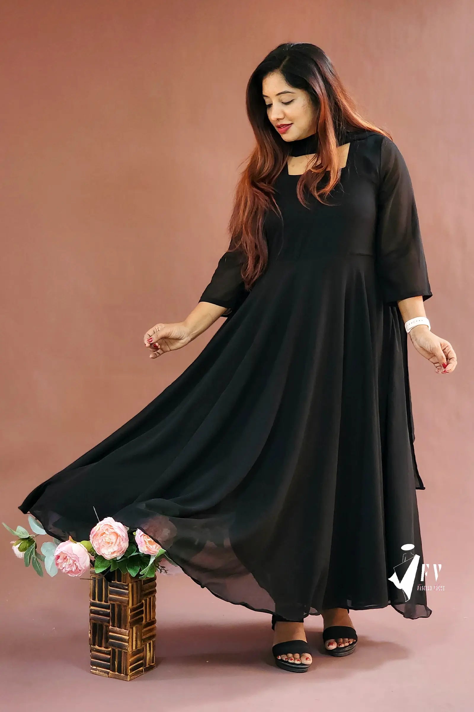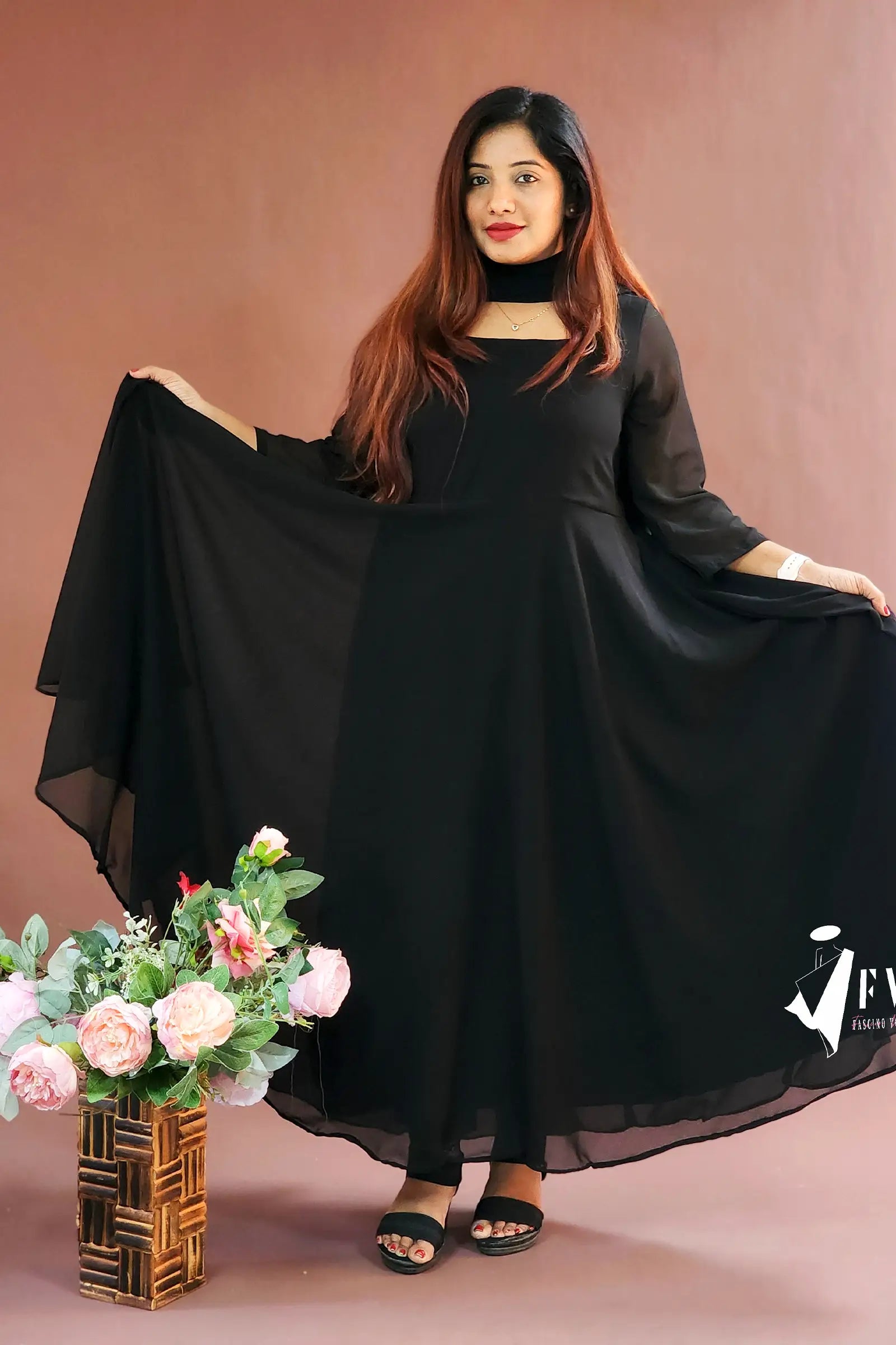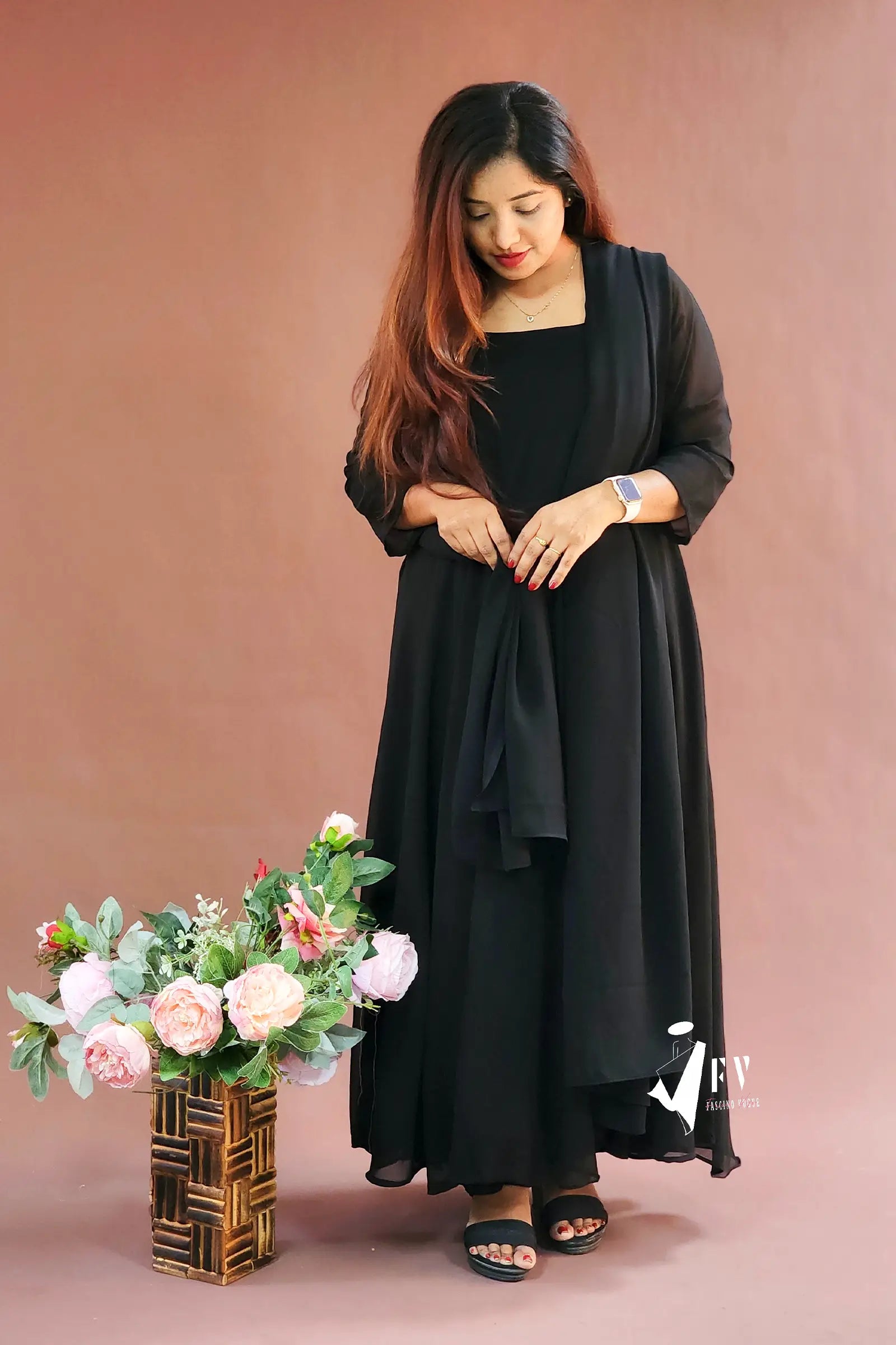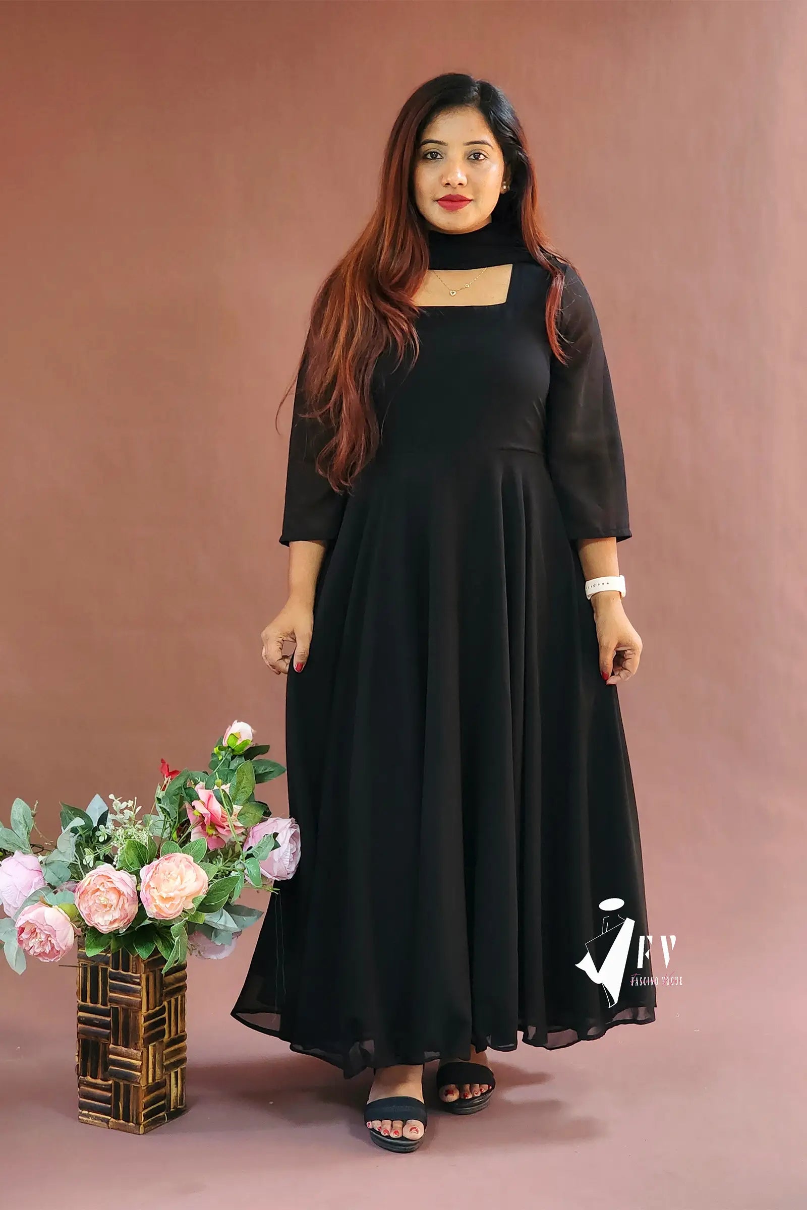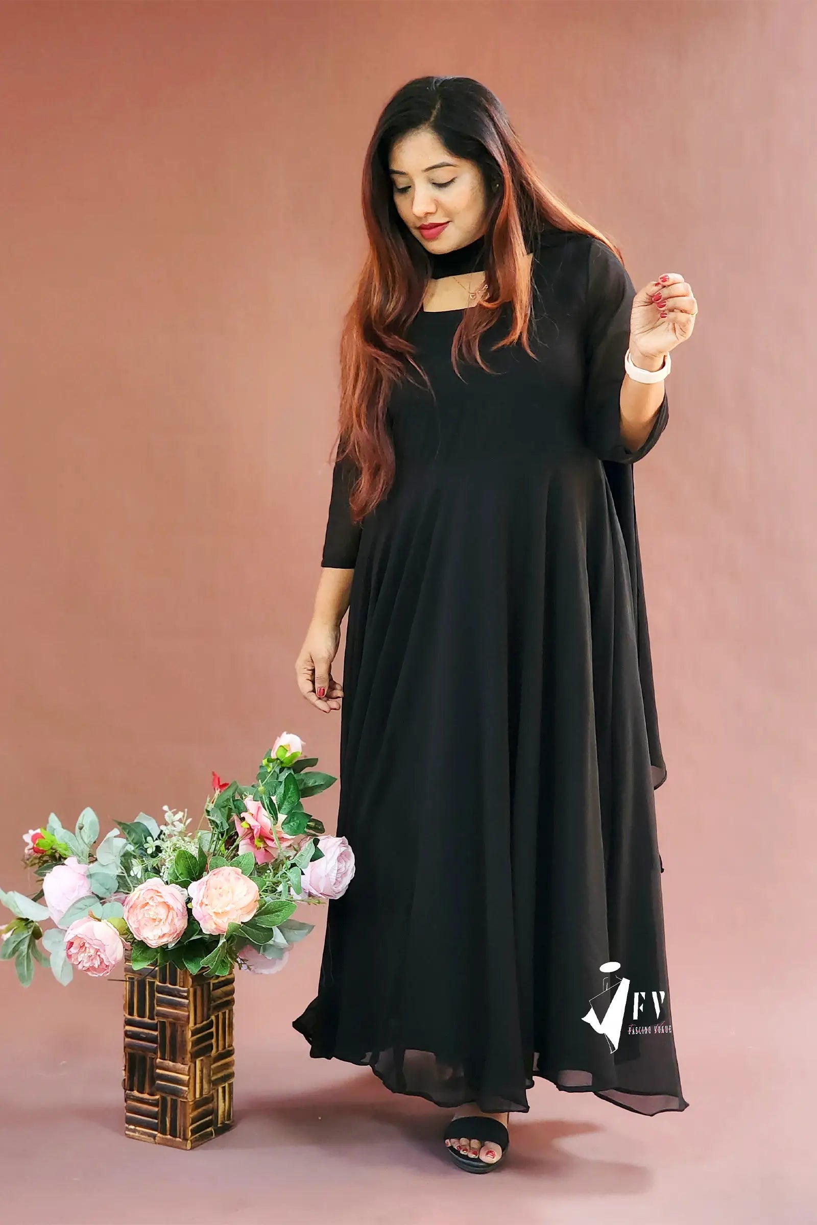Elevate your style with this beautiful black Georgette Anarkali set featuring 3/4 sleeves, perfect for parties, weddings, and any special occasion. The full circular flare of the Anarkali adds a touch of elegance, while the complete ensemble includes a matching pant and georgette dupatta.