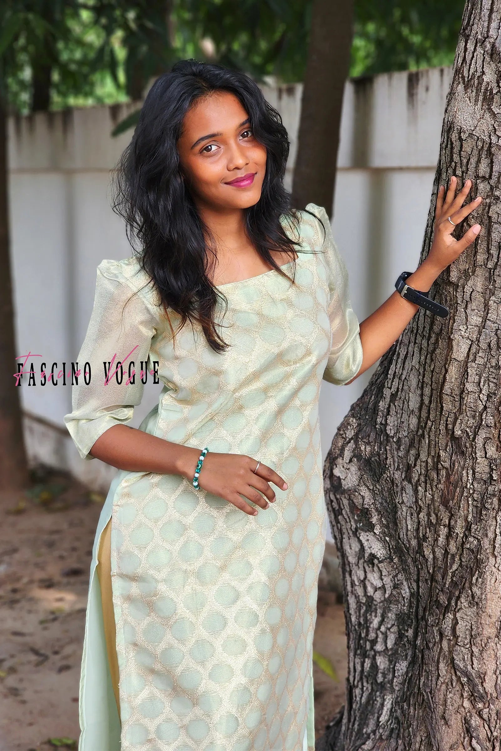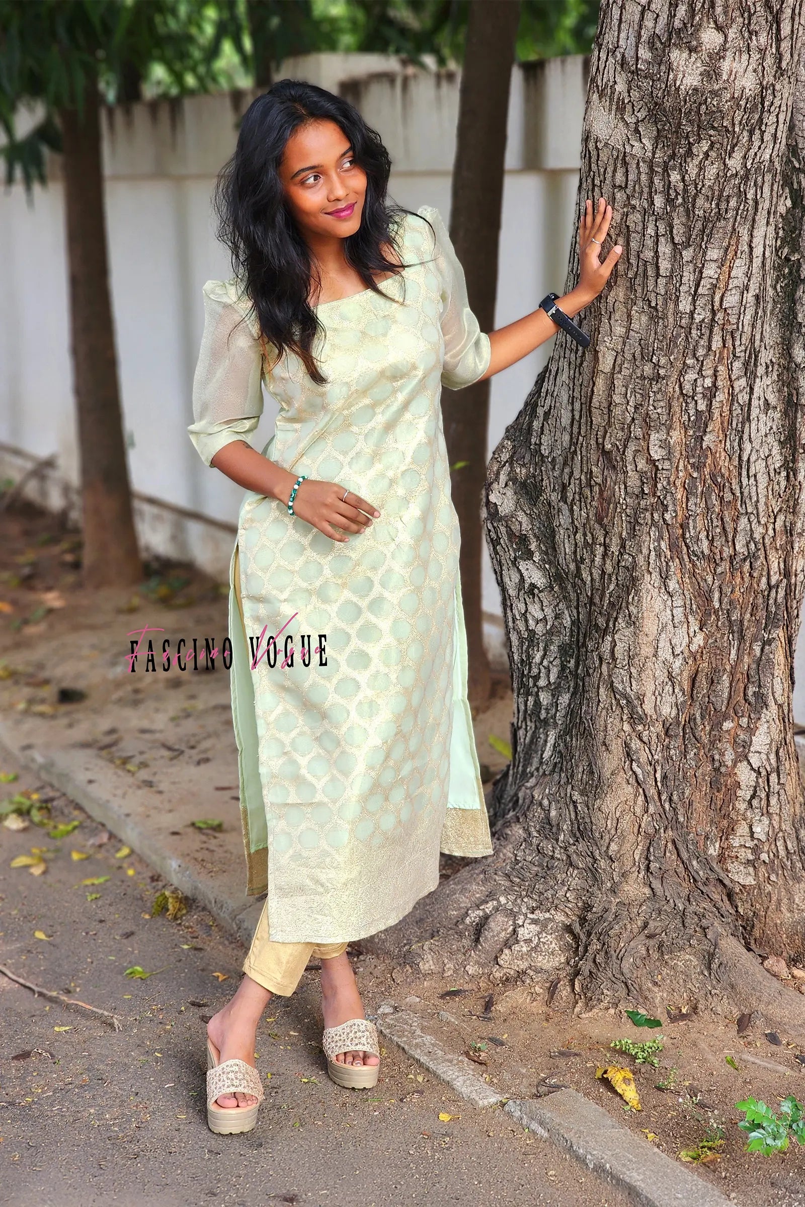 A pastel green Banarasi top and dupatta that can be paired with leggings for any special event. It is stitched with lining inside.
