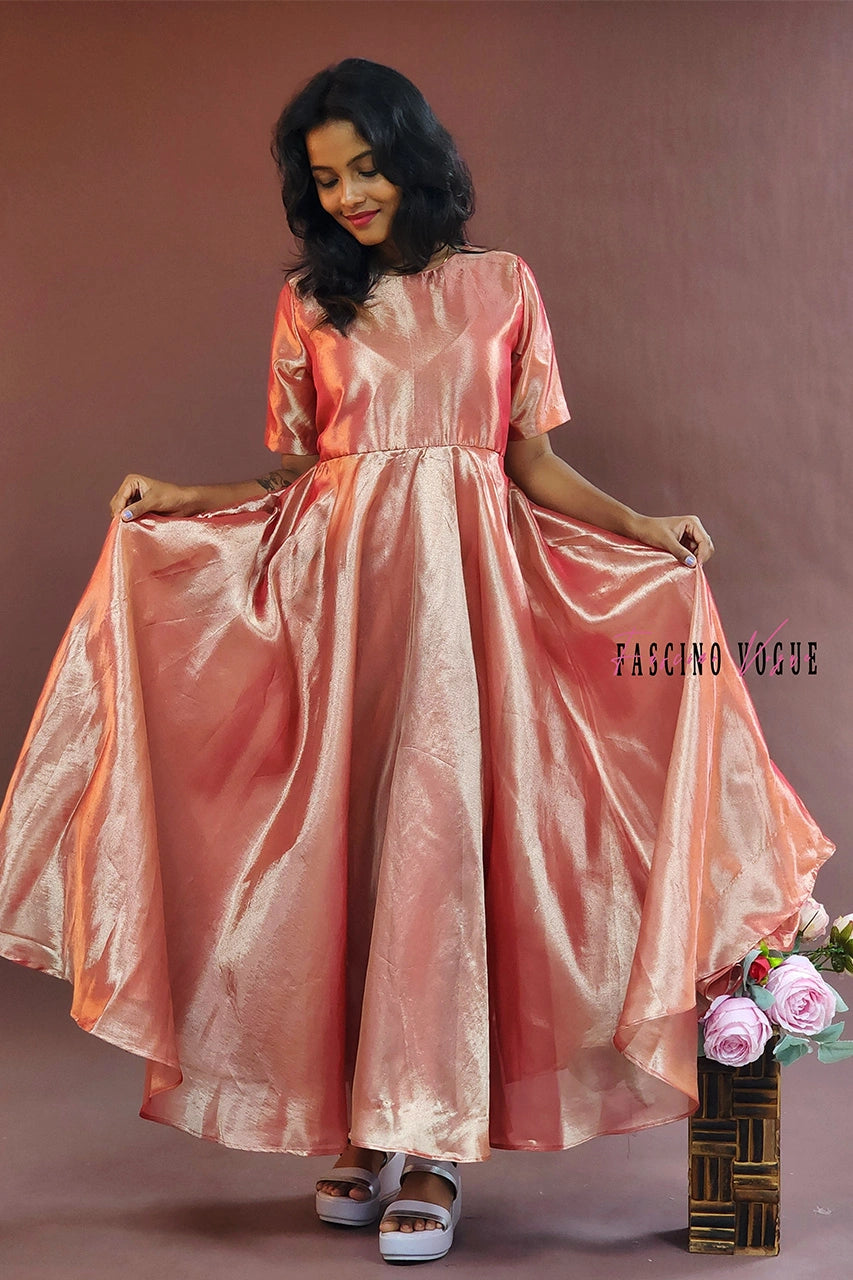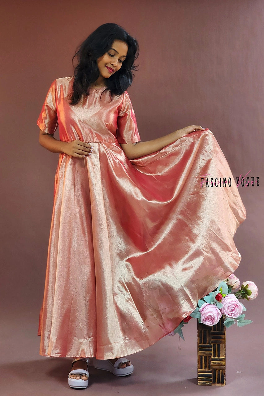 This is a classy silk peach ankle-length gown with super cute elbow sleeves and a boat neck. It’s perfect for any special event. The gown is stitched with lining inside for added comfort and structure.