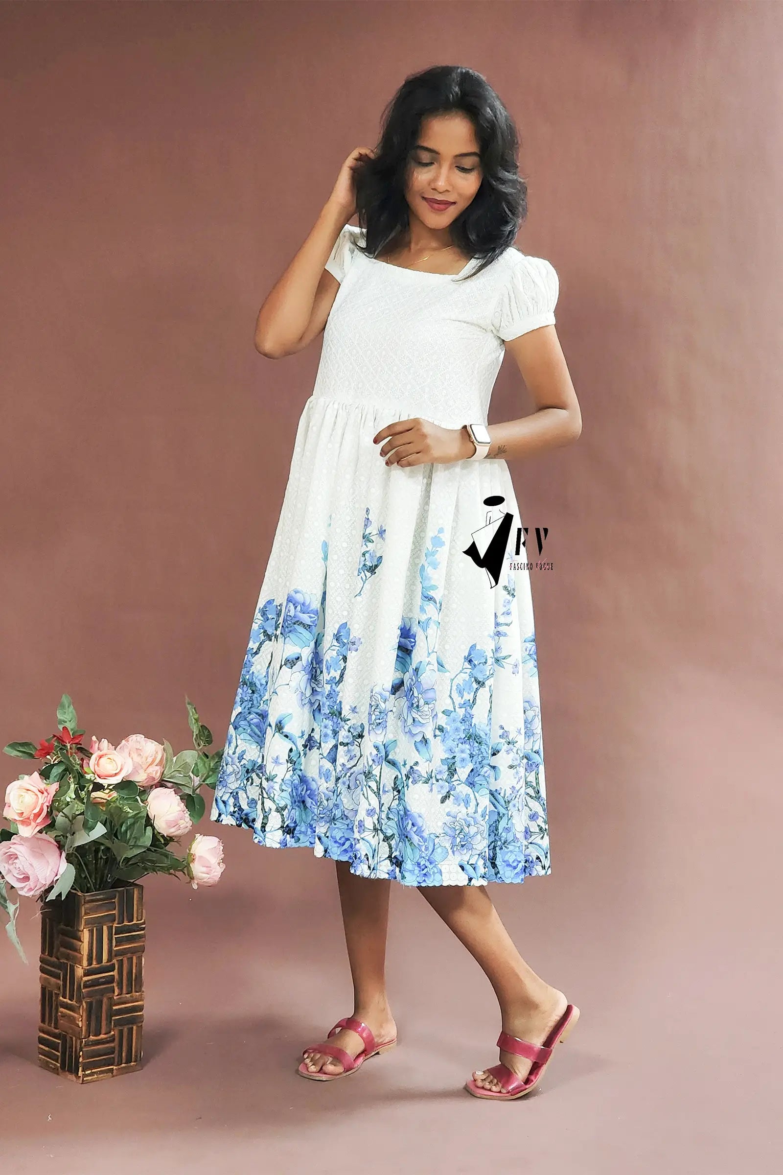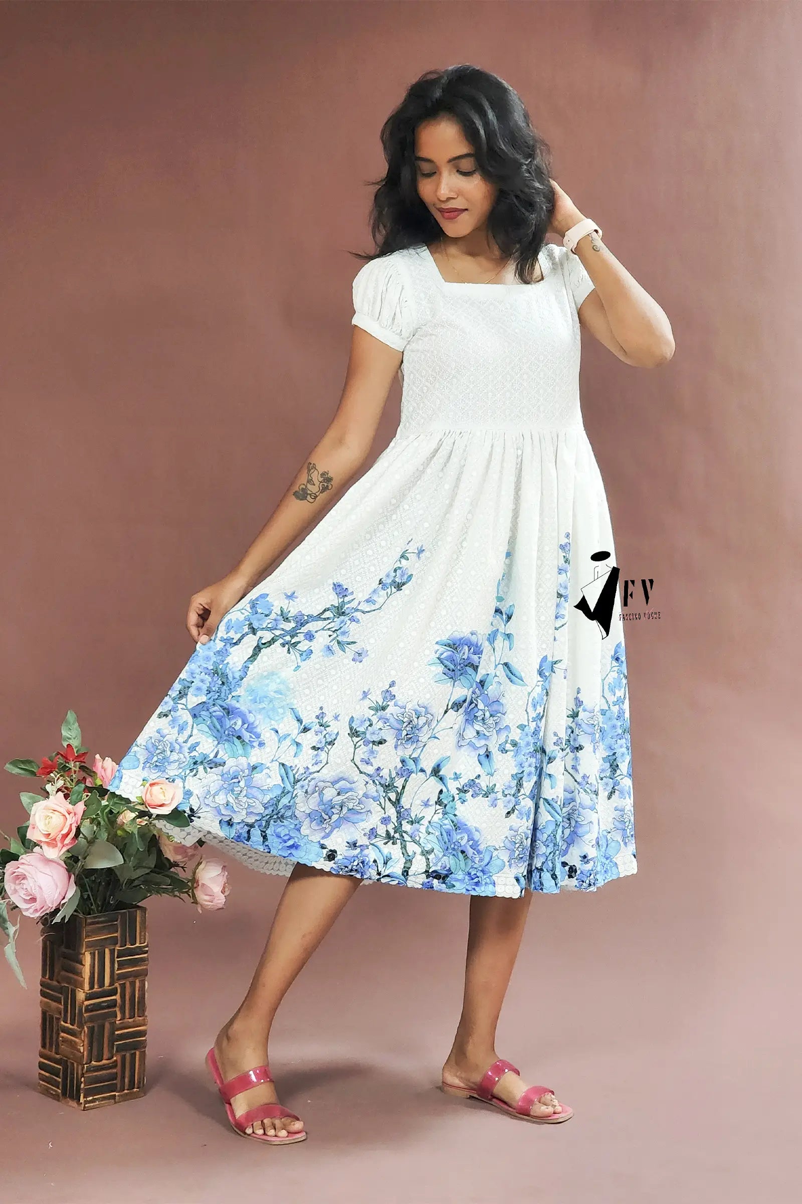 Elevate your style with this beautiful white Akoba cotton dress featuring charming blue printed flowers. Versatile enough to be worn as a dress or paired with jeans or leggings, it’s perfect for a day out, work, or college. The top is stitched with lining inside for added comfort and quality.