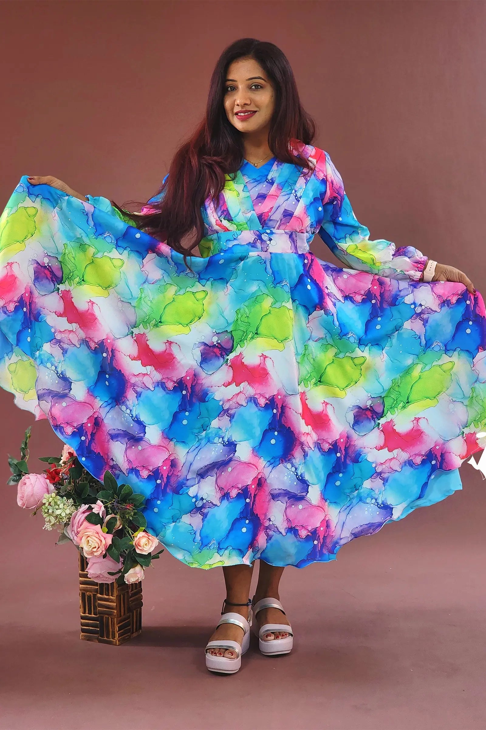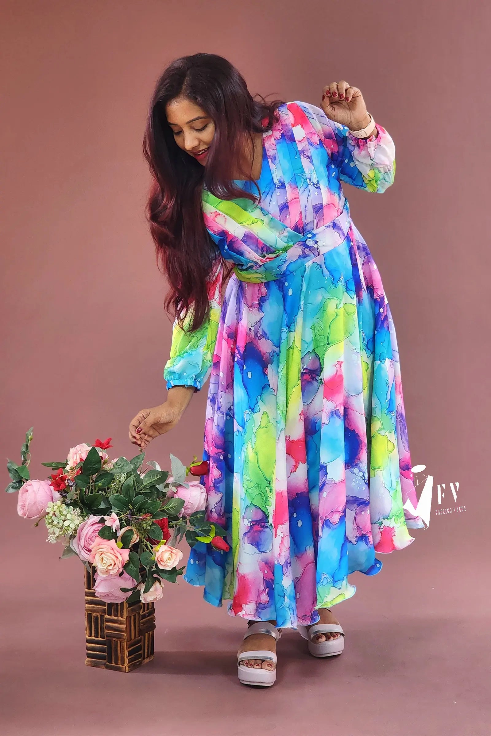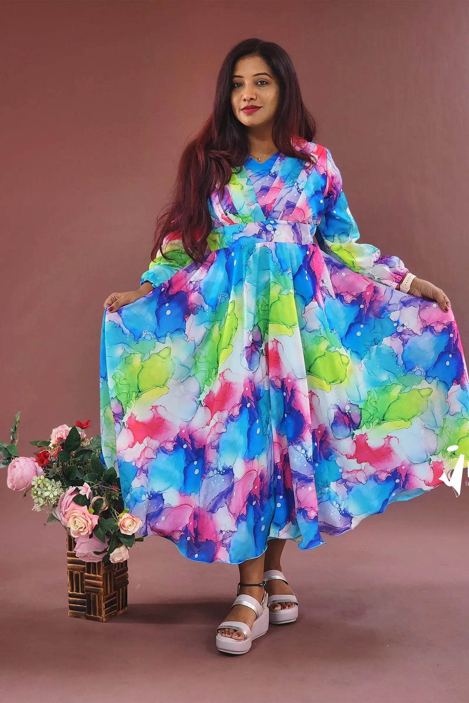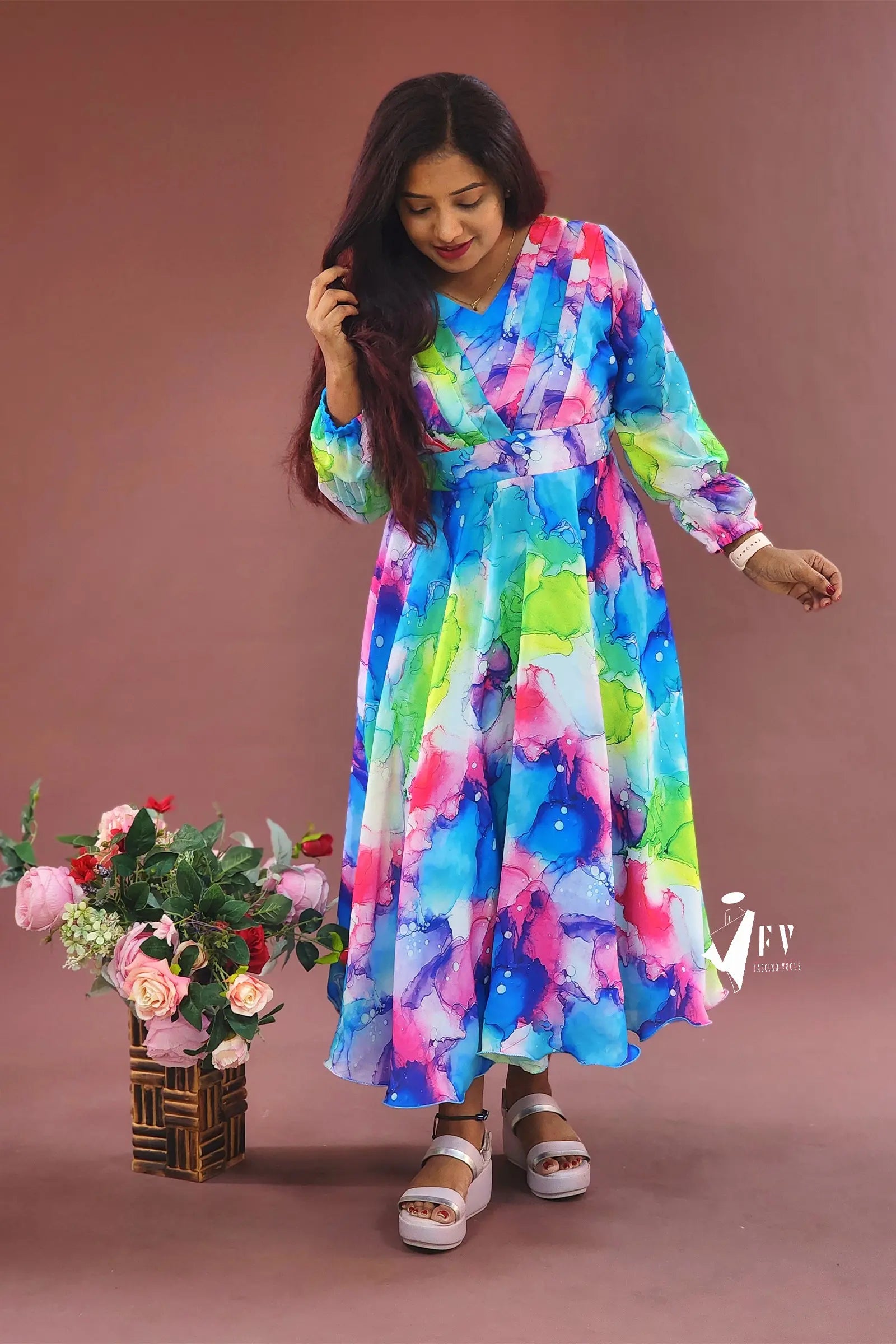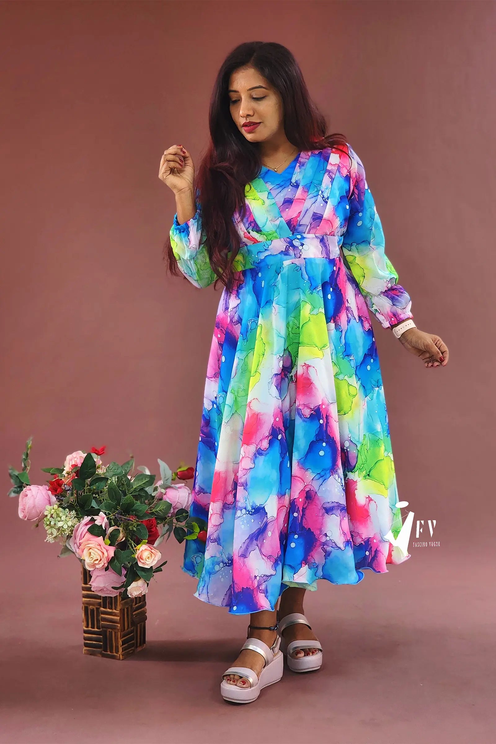 This pretty and classy multi-color circular dress with a draped yoke and 3/4th sleeves is perfect for any casual day. Made from soft American crepe fabric, the dress is stitched with a lining inside for added comfort, making it an ideal choice for everyday wear.