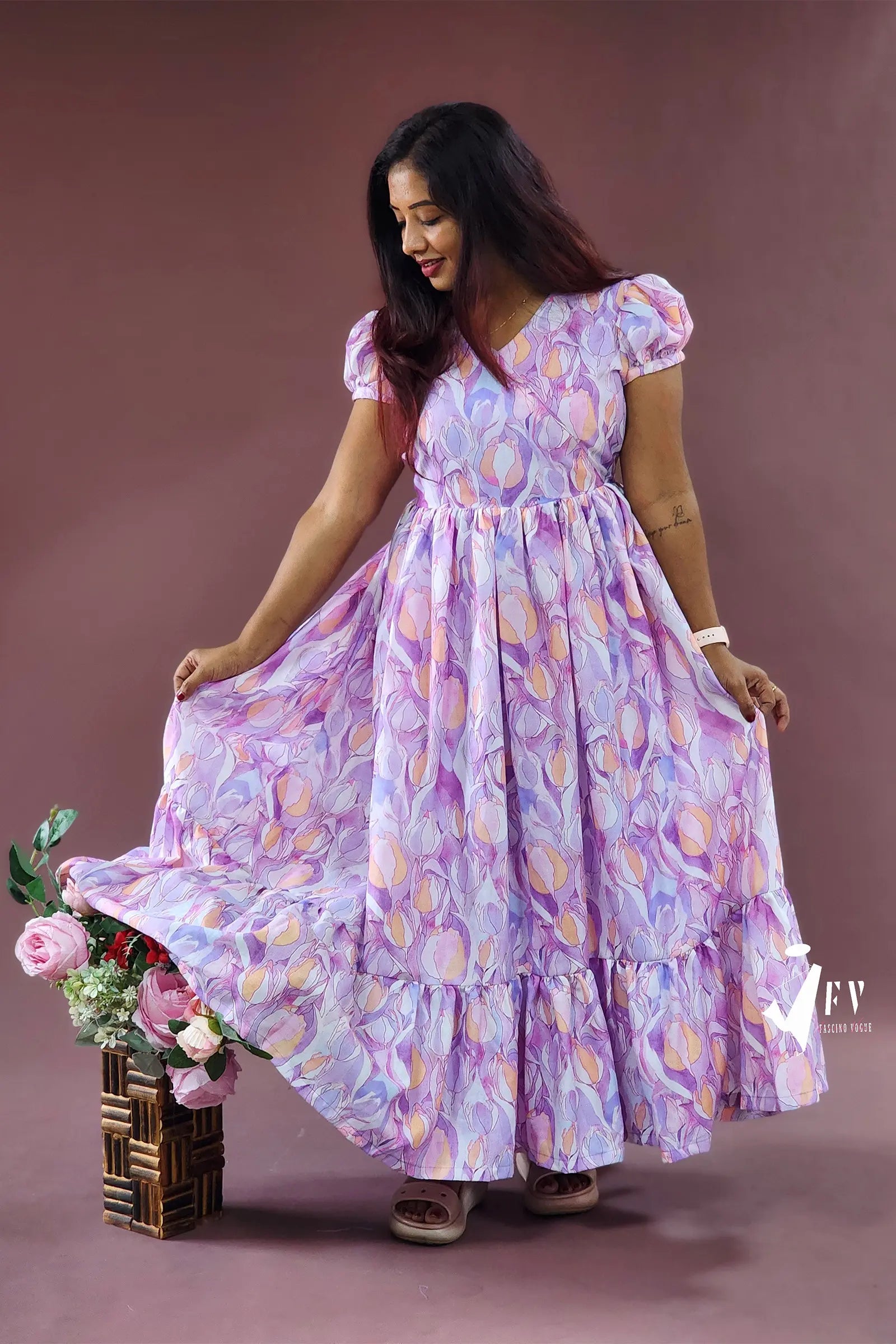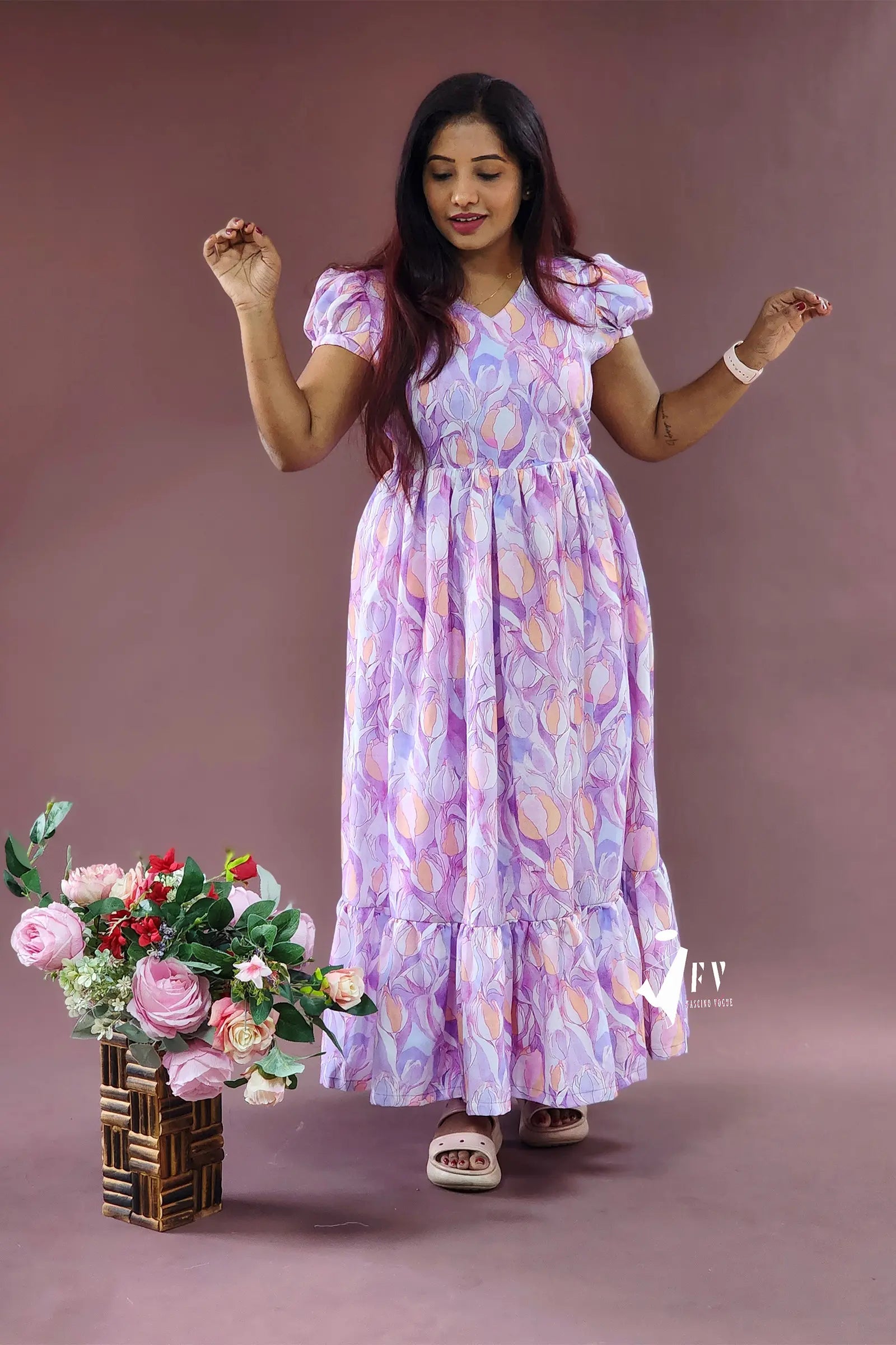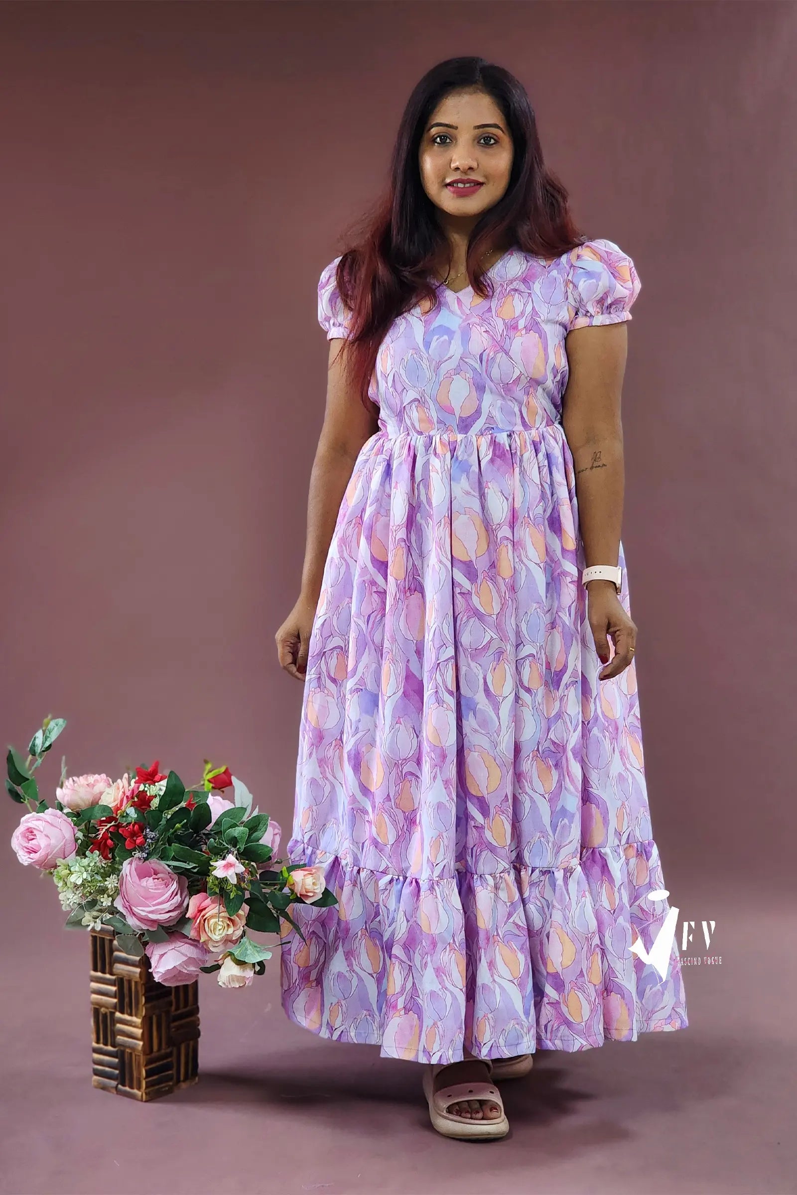 This pretty lavender printed calf-length dress, featuring super cute puff sleeves, is the perfect choice for any casual day. Made from soft cotton fabric, the dress is stitched with lining inside for comfort and durability, making it both stylish and practical.