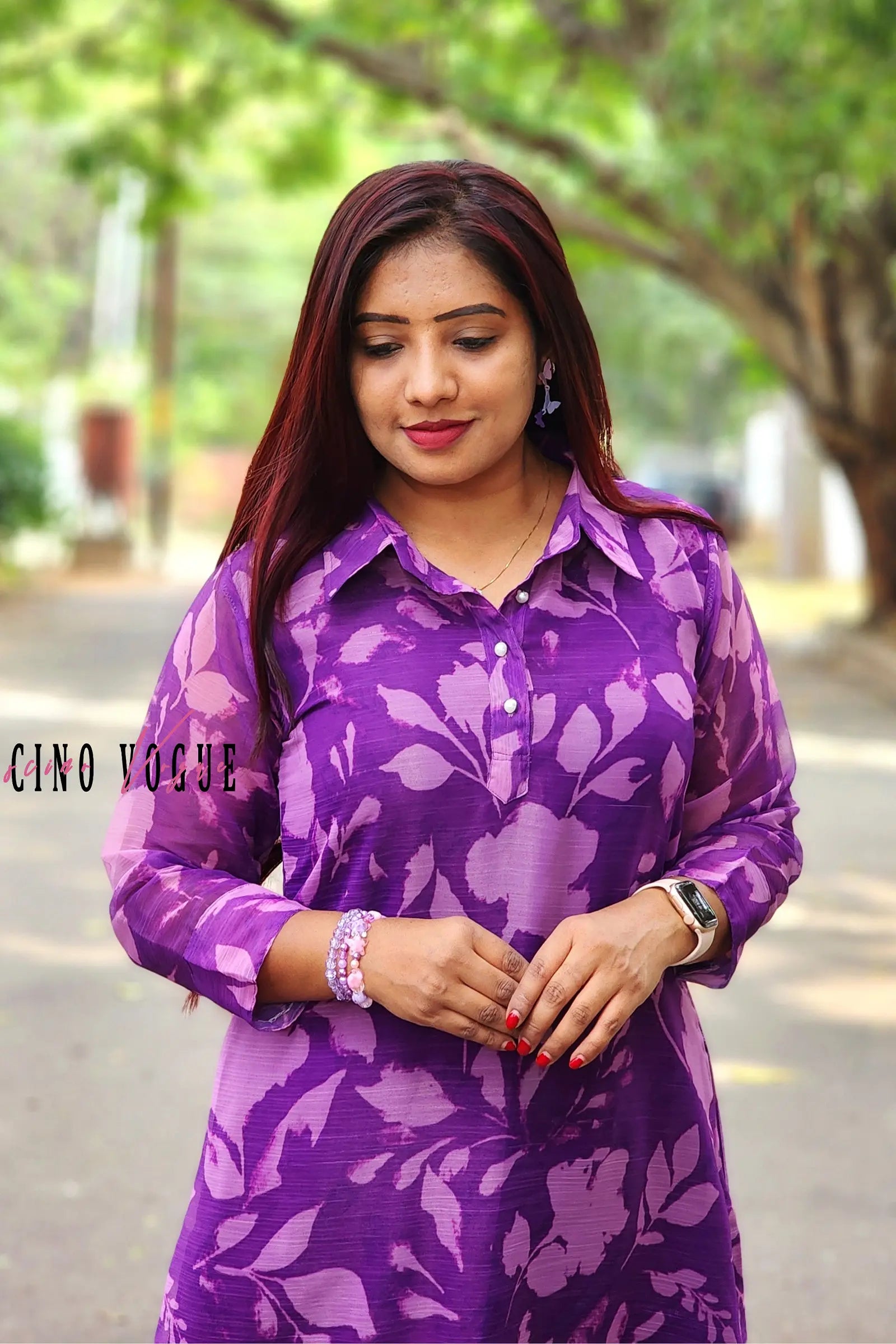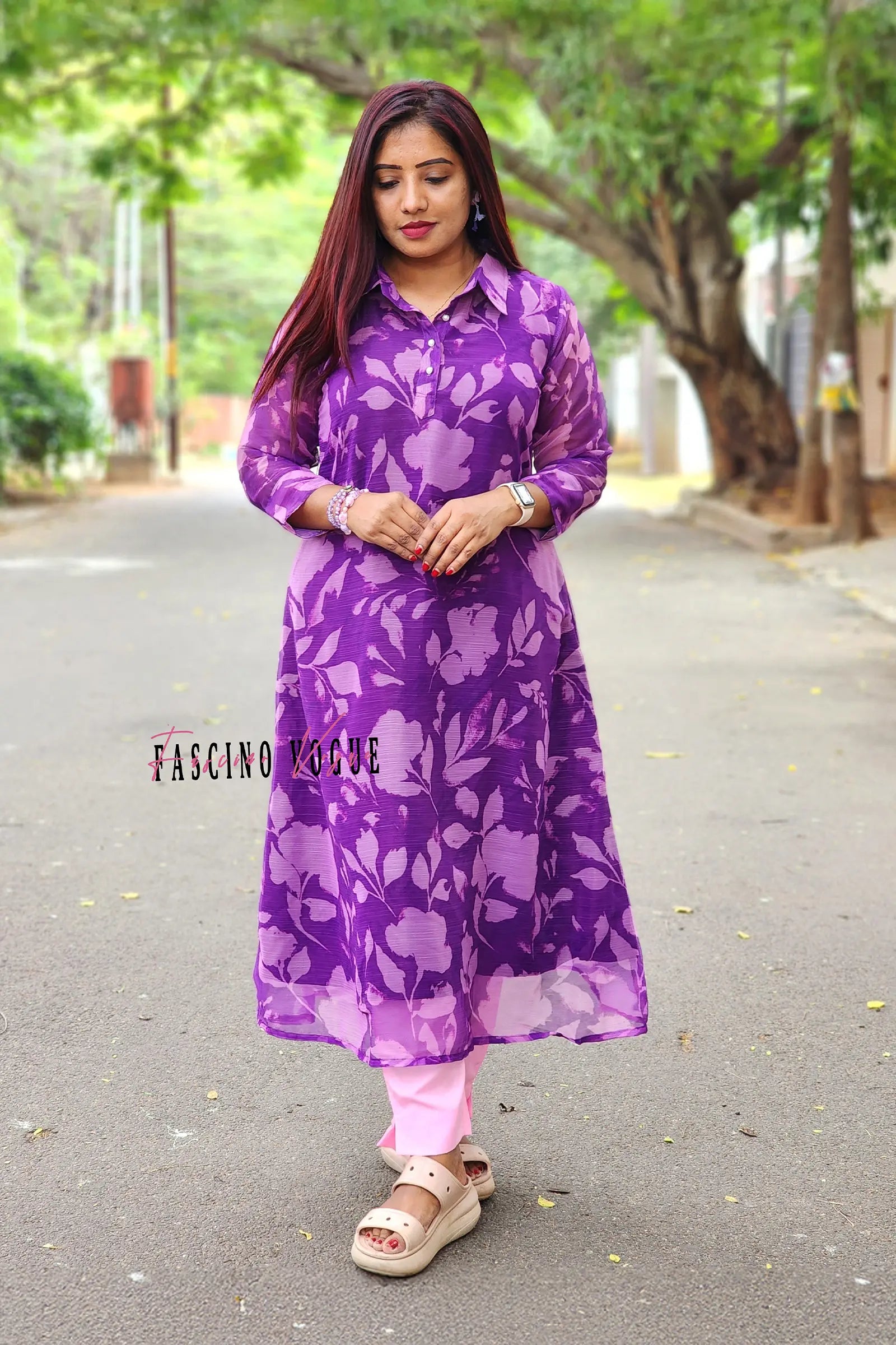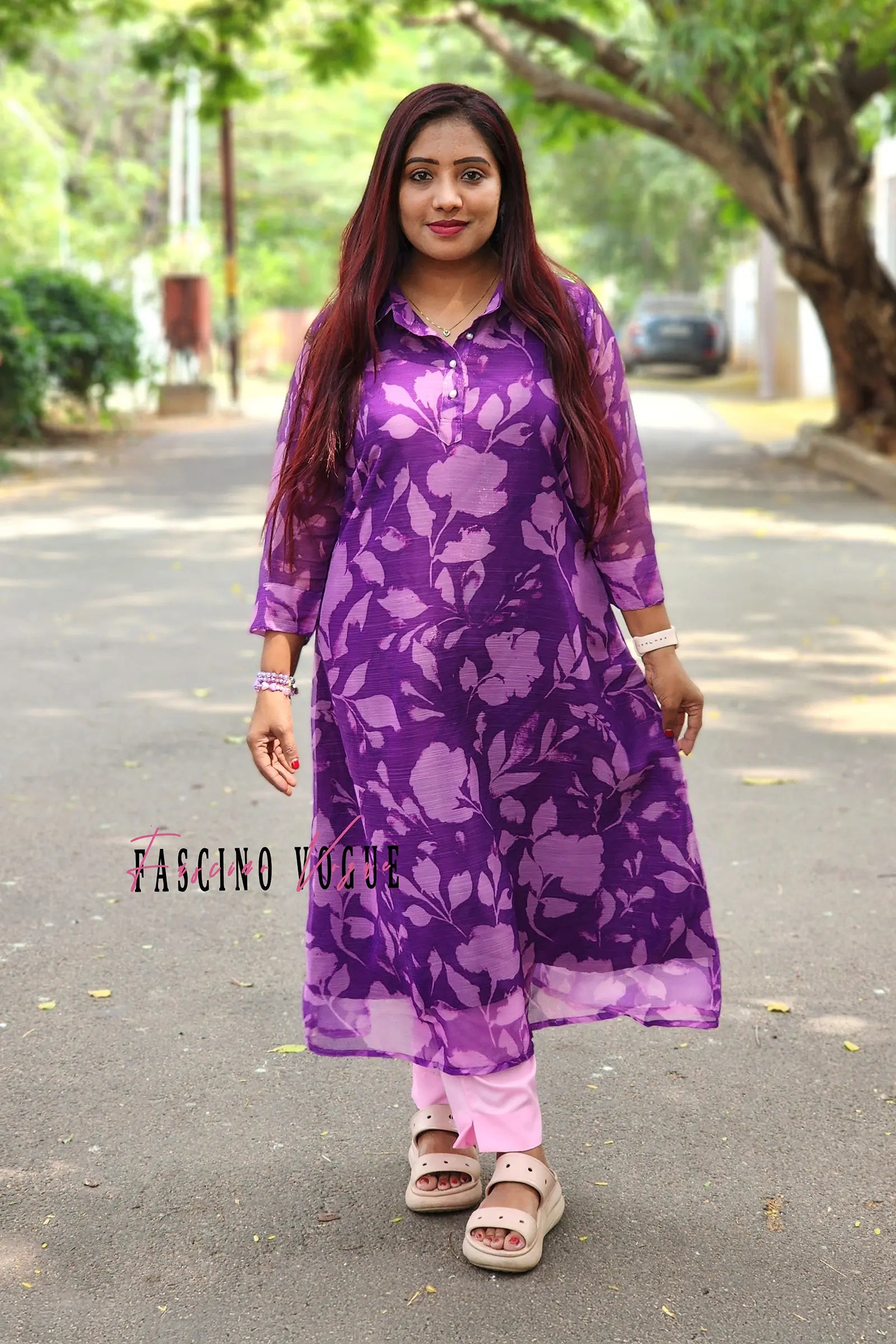 A purple pink georgette Anarkali and pant set, perfect for any casual day out. It is stitched with lining inside.