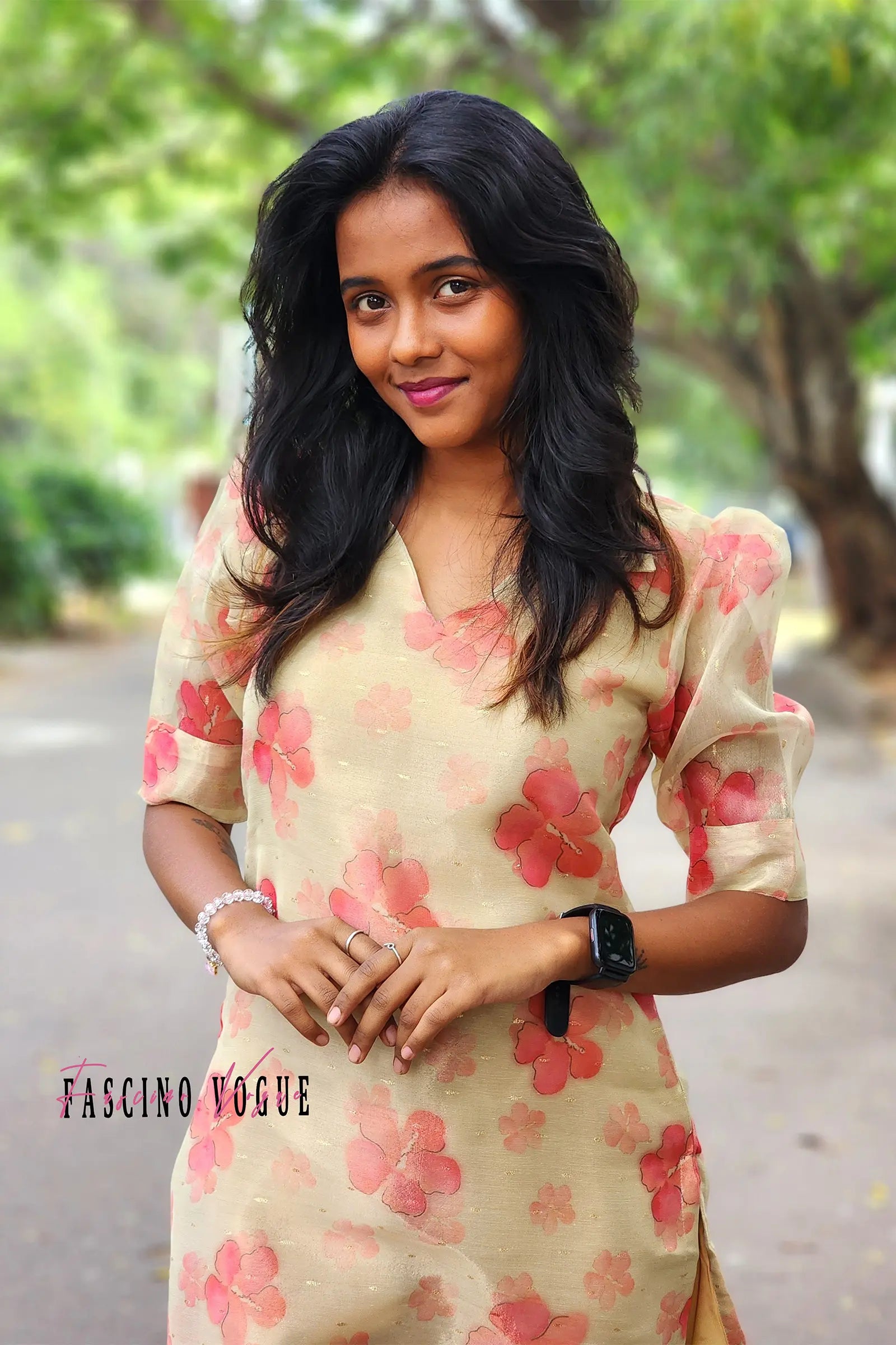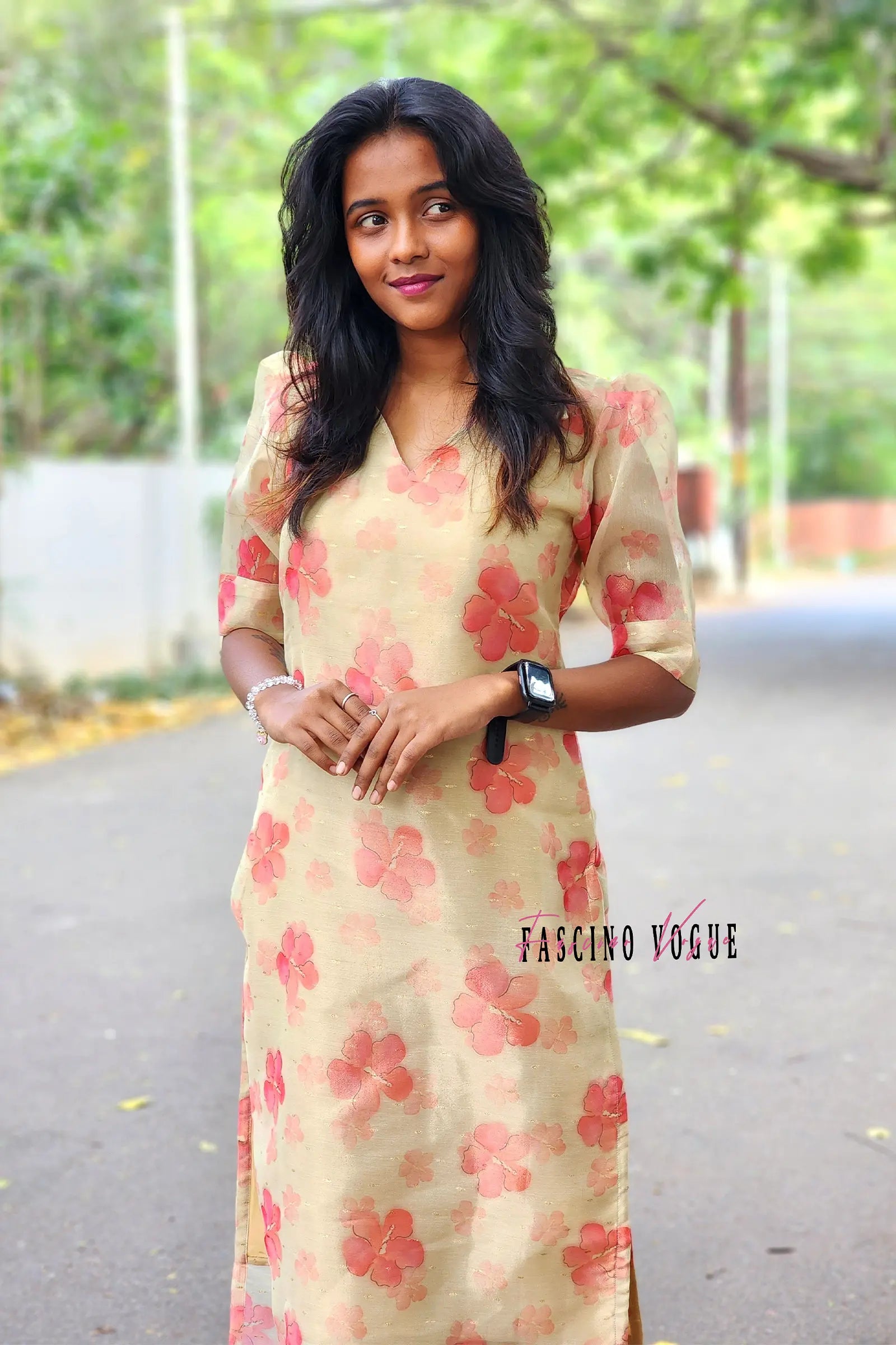 A beautiful silk organza kurtha that you can pair with jeans or leggings for any special event. It is stitched with lining inside.